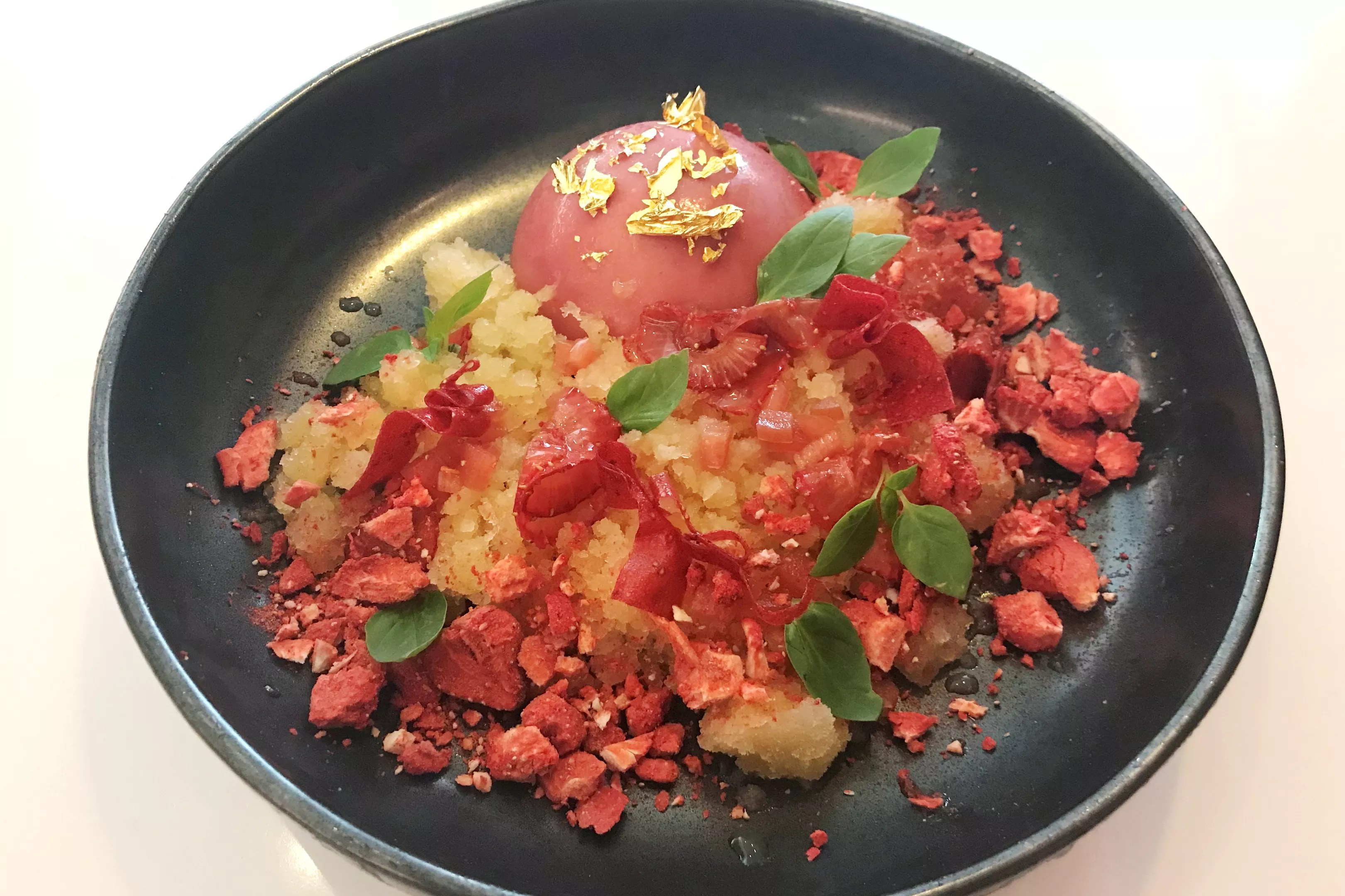 Departure also creates desserts specific to brunch, including a strawberry mousse that brunch manager Shane Atkins says is just too pretty to pass up. And he was right: a hemisphere of pink mousse, set off by a black plate, is surrounded by lemongrass shaved ice and strawberries in various forms – dried, fresh and in ribbons of jelly. To top it off, gold leaf shimmers on its perch at the peak of the mousse dome.