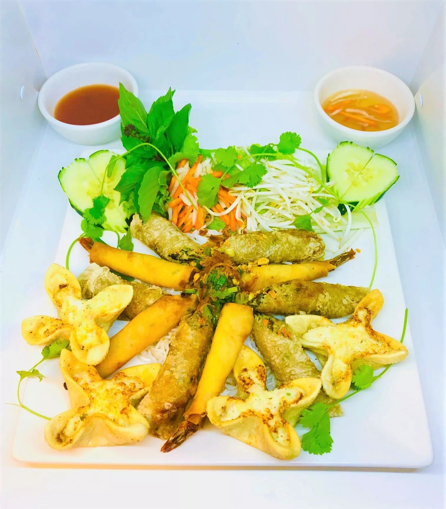 An appetizer with housemade crab cheese wontons (with real crab), shrimp rolls and egg rolls.