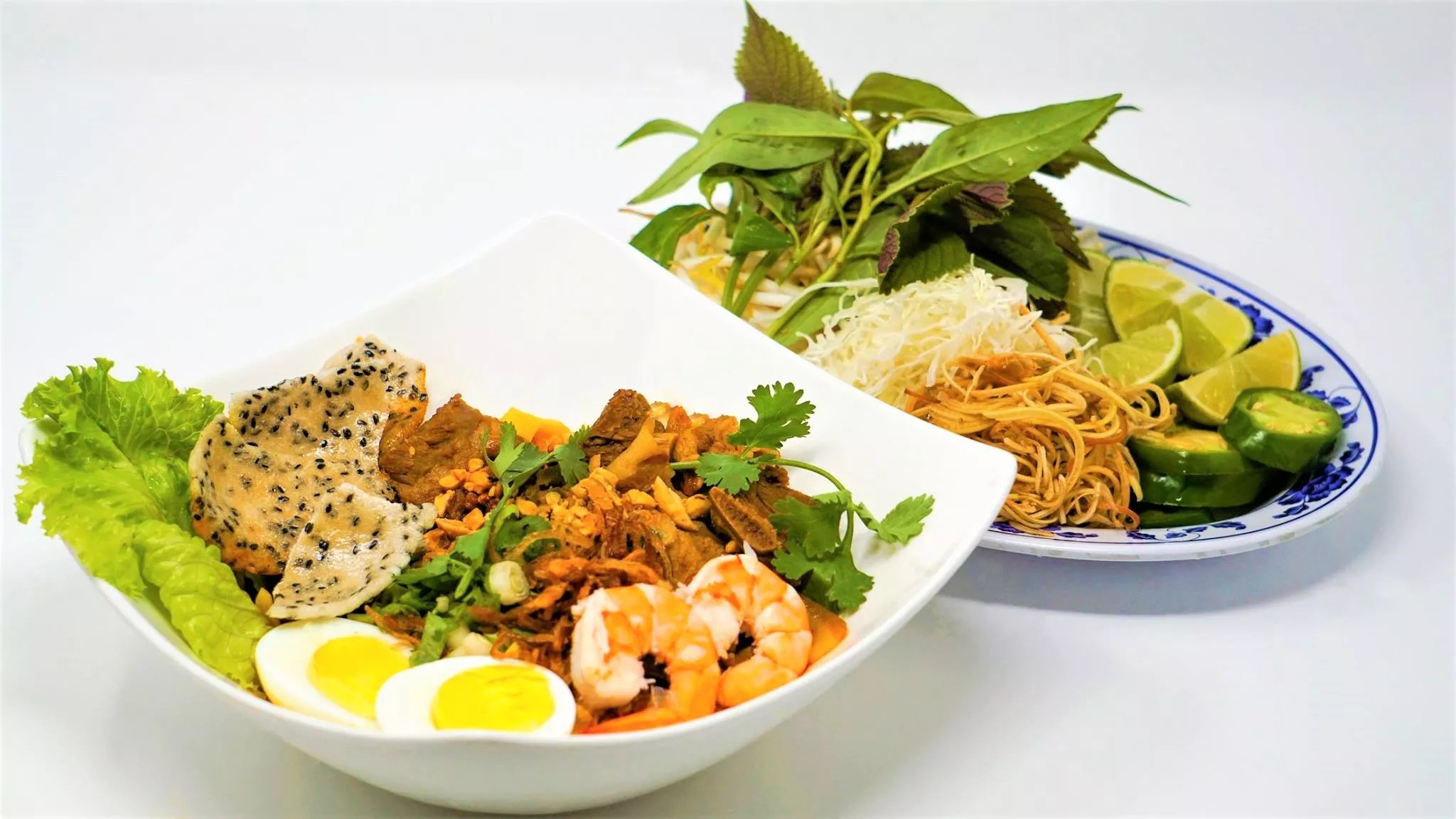 Mi Quang is another noodle bowl that’s not quite a soup, a central Vietnamese dish that comes with sesame rice crackers. “We serve it with very little broth, but people from the middle of Vietnam ask for even less,” he says. “When you taste the broth, it’s like art – you don’t need much.” Now Pho’s mi Quang sports broad egg noodles and comes with pork ribs and shrimp or bone-in chicken.
