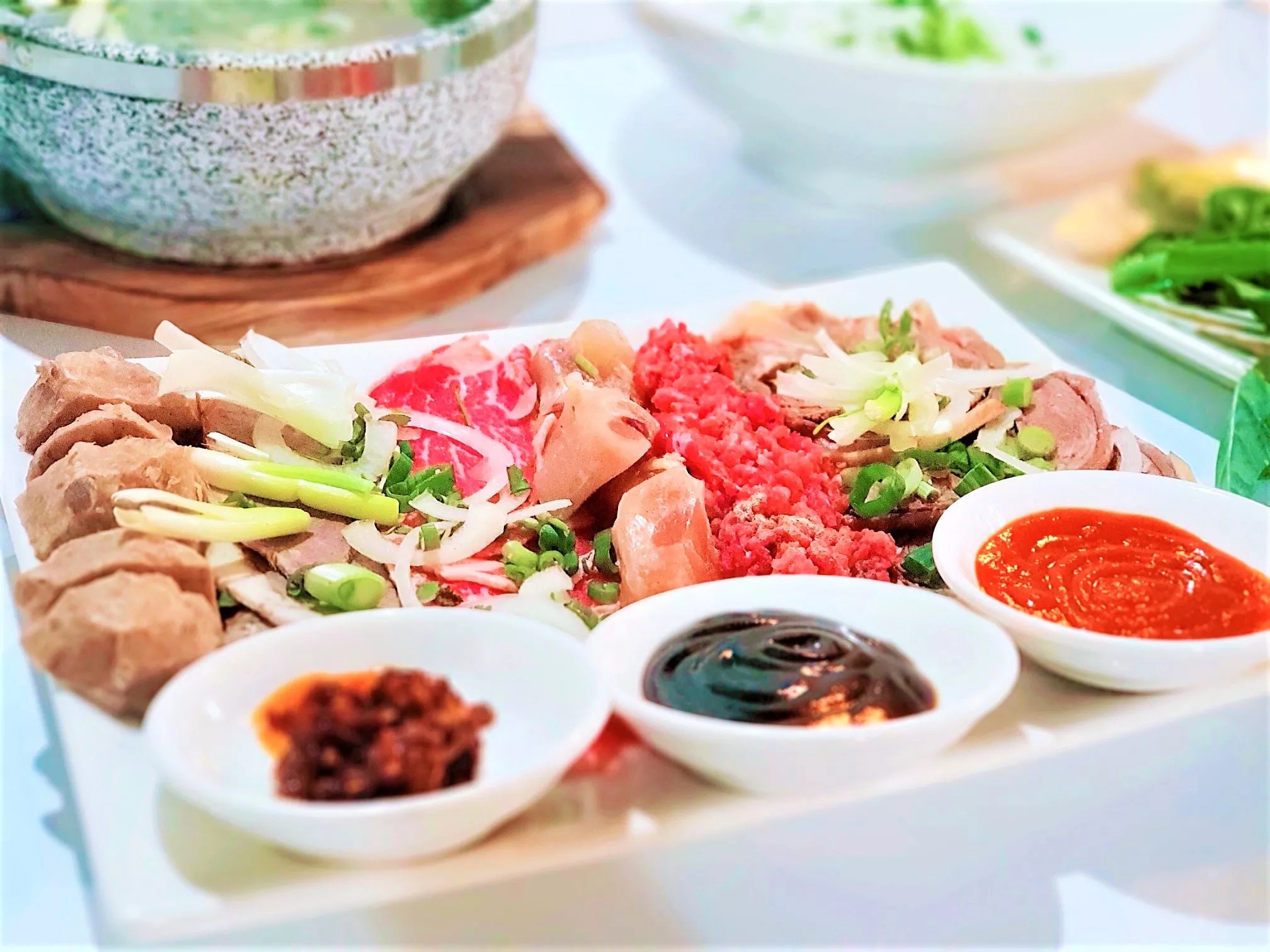 A platter of meats and sauces for the Pho Two Bowls special.