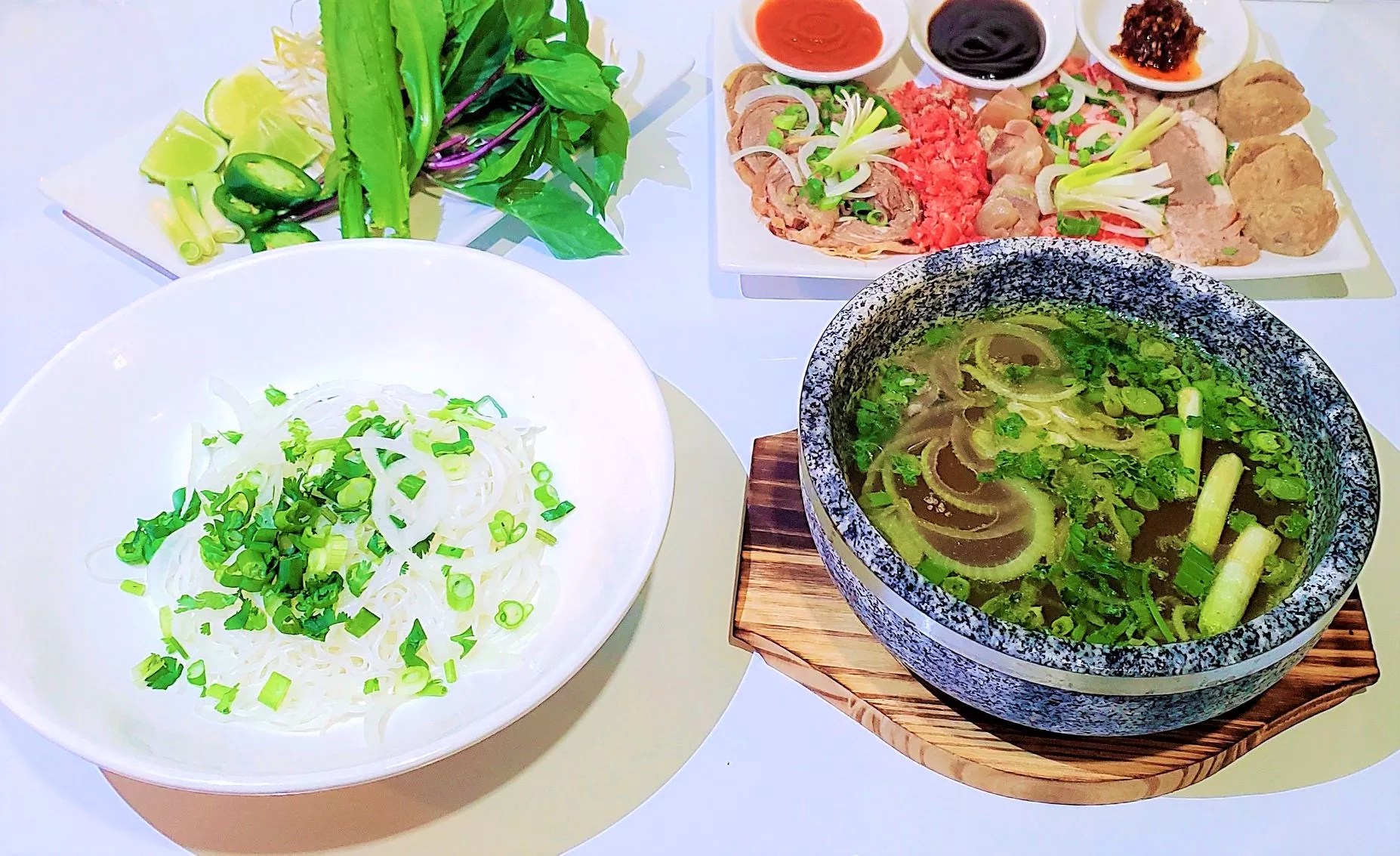 A platter of meats and sauces for the Pho Two Bowls special.