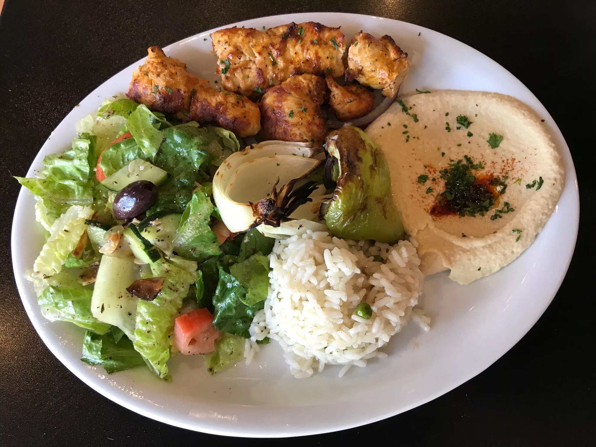 The new Cafe Byblos has been open for about a month and features Greek and Lebanese favorites like gyros, feta and fatoush salads, moussaka, kabobs, and chicken shawarma. It’s a casual spot with a focus on family and quality food, according to the cousins. They’re still tweaking the menu, as they’ve found it difficult to find good distributors here, but the chicken, which comes from Red Bird Farms, is a bestseller. The shawarma is marinated and cooked on a vertical grill for about fifteen minutes to get that perfect crispiness. The Khraims add that they’re starting to pick up steam and are getting busier every week.