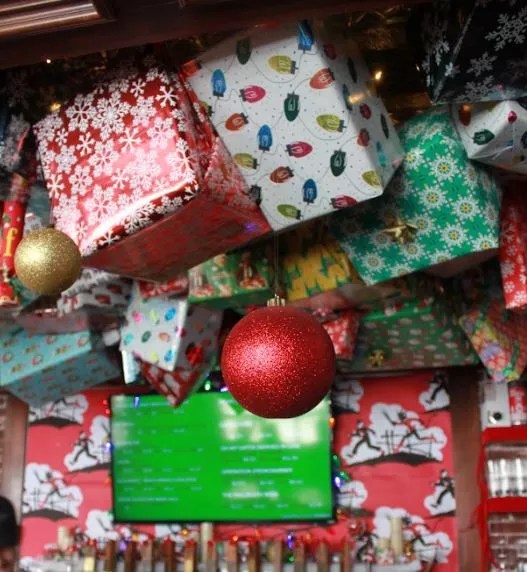 All of the materials for the bar display were ordered on November 1, after the brewery’s graphic designer had settled on the look and feel. “Shea, our taproom manager, took an entire day to order everything,” Bell notes. “We stored everything at an Amazon fulfillment center; we shipped it in huge boxes.” The team reused many of the boxes by wrapping them into gifts for decorations as a way to minimize waste. It took the better part of three days to set up the entire production, and the brewery had to shut down for two of those days.