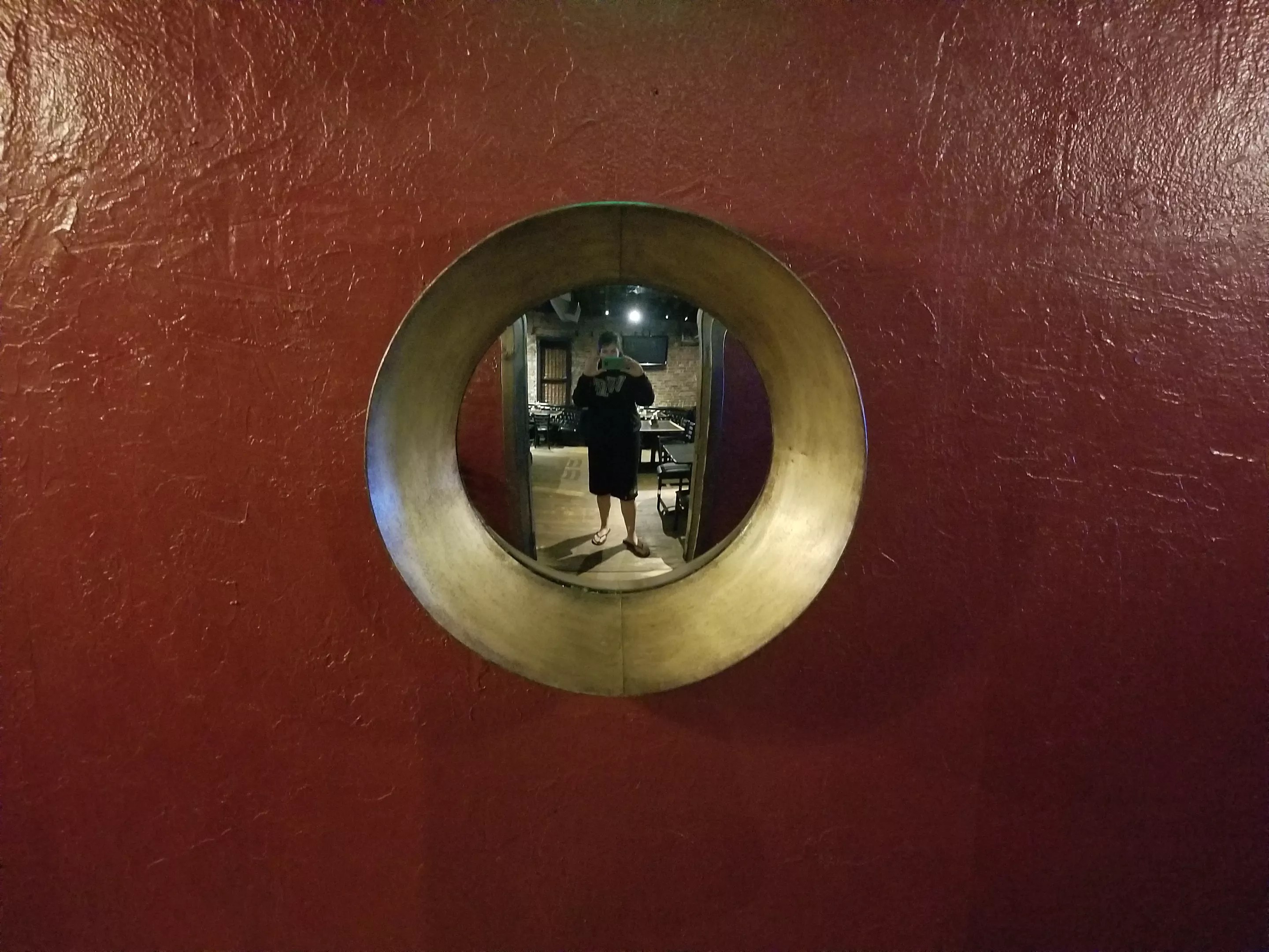 A fish-eye mirror adds an interesting touch to the wall by the restrooms.