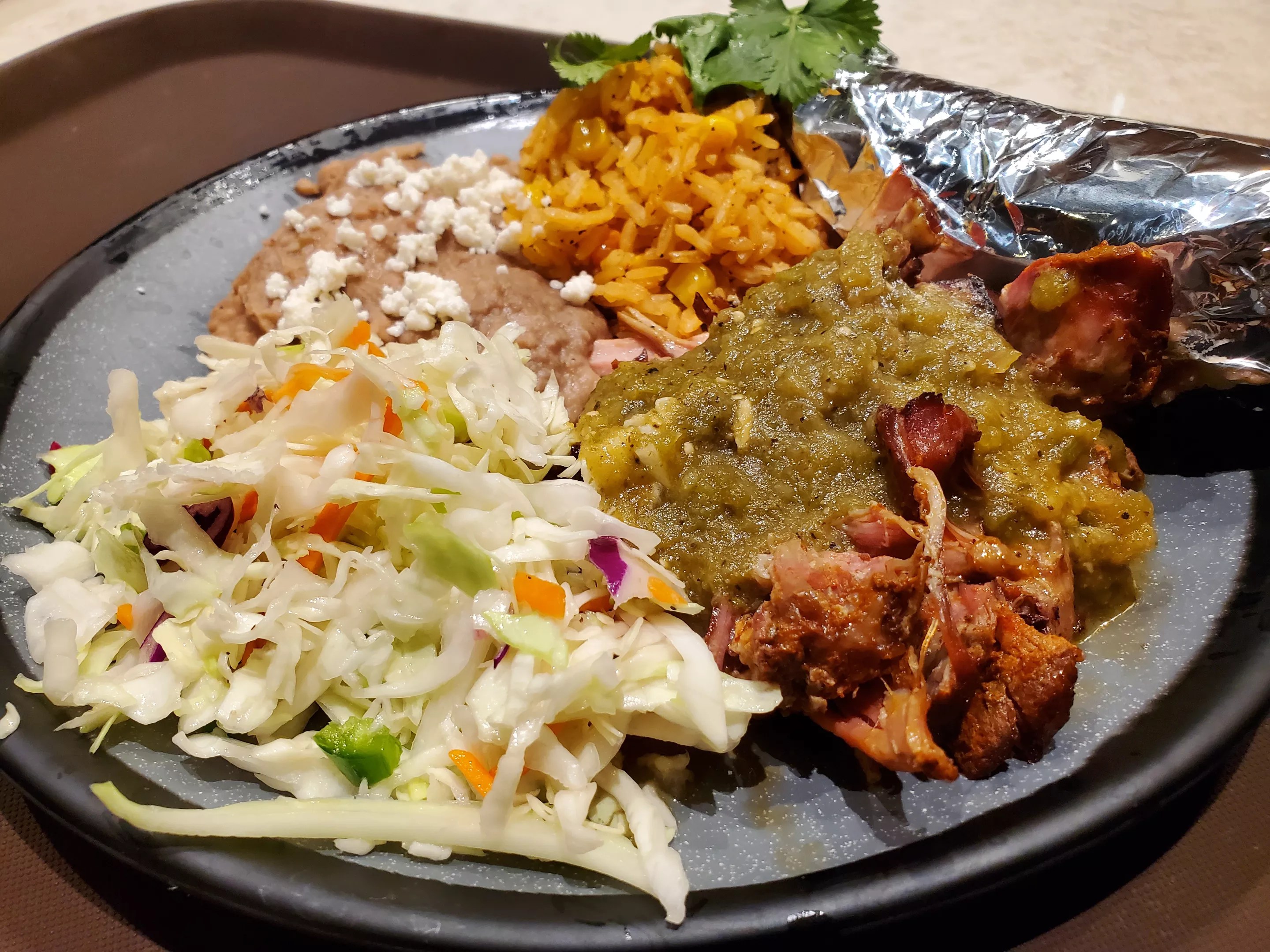 The rest of the dishes come with a scoop of salad plus super-flavorful rice and beans, and all of them are gluten-free. You can choose from enchiladas topped with red or green sauce, or both for Christmas style; big chunks of carnitas topped with green chile sauce; adobo chicken; picadillo with green chile; chicken mole negro; camarones (shrimp in adobo sauce); and a vegetarian option, calabacitas, that includes squash, roasted corn, cauliflower, roasted poblano and queso fresco.
