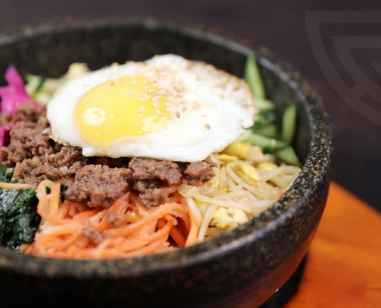 Bibimbop at Bop & Gogi, served in a stone pot bowl.