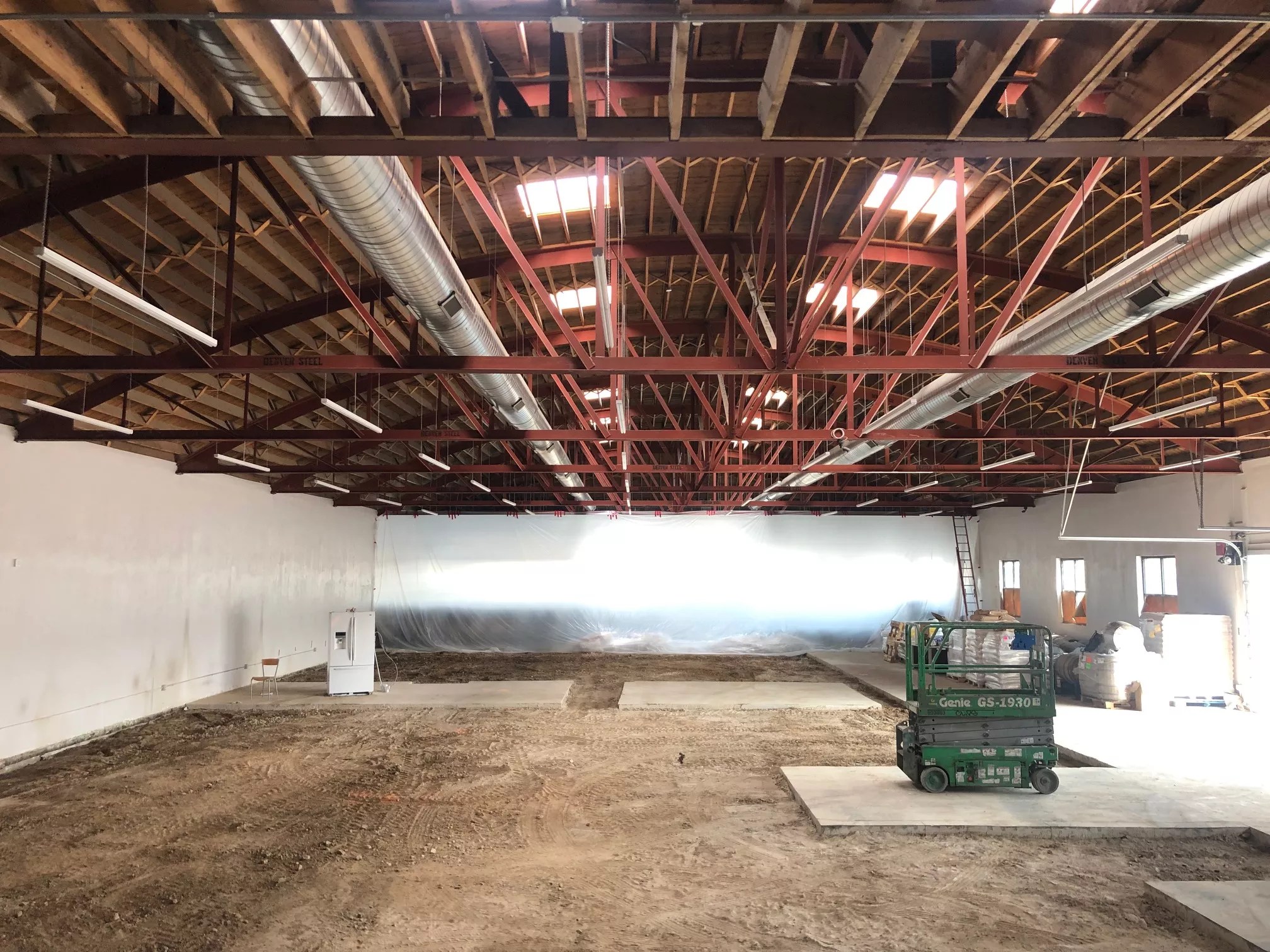 Eventually, Buchan plans to add a large, L-shaped taproom looking out onto both Colfax and Florence Street, as well as a second-story mezzanine with room for about sixty people. The high, sweeping barrel roof and steel trusses (still bearing the 1950s-era Denver Steel Company name) lend themselves to a second story, Buchan adds. A huge cold room will sit underneath the mezzanine.