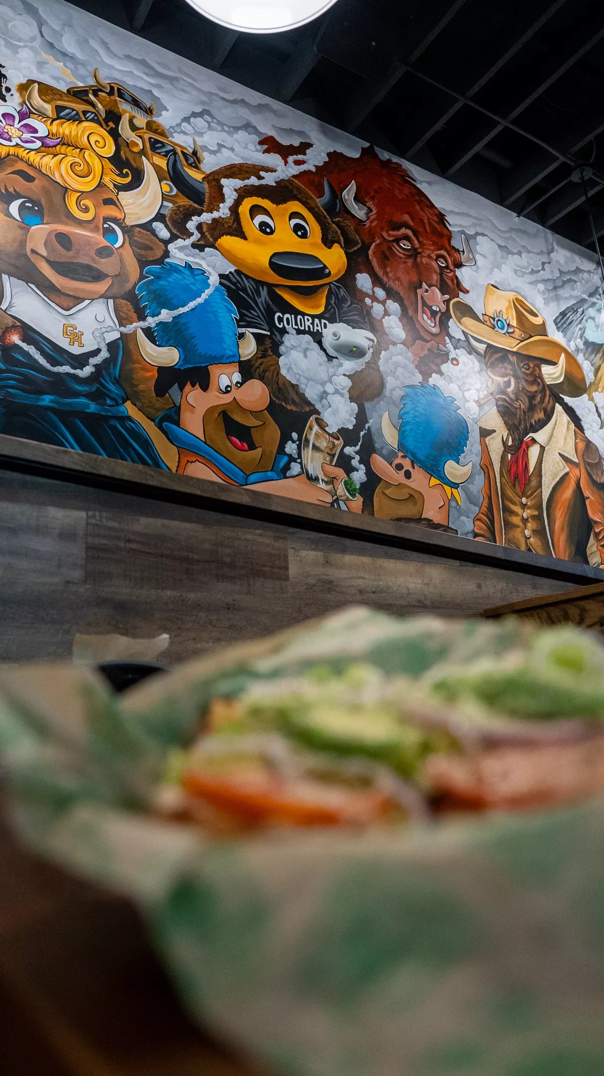 Some are cheeky, filled with visual Easter eggs like bottles of gin and Kool-Aid (references to hip-hop and to Cheba Hut’s signature drinks), or nods to cannabis culture. As for Larsen’s favorite mural, he is quick to admit that two make the cut: “The Aurora location, it’s got the old-school hip-hop vibes to it and a bunch of nods to the hip-hop of the ’80s and early ’90s … that was a big part of my life growing up. I also really like our Johnstown location. There’s nothing really particular about Johnstown, so the mural has all of the famous Johns, like Johnny Rotten, John Candy and so on.”