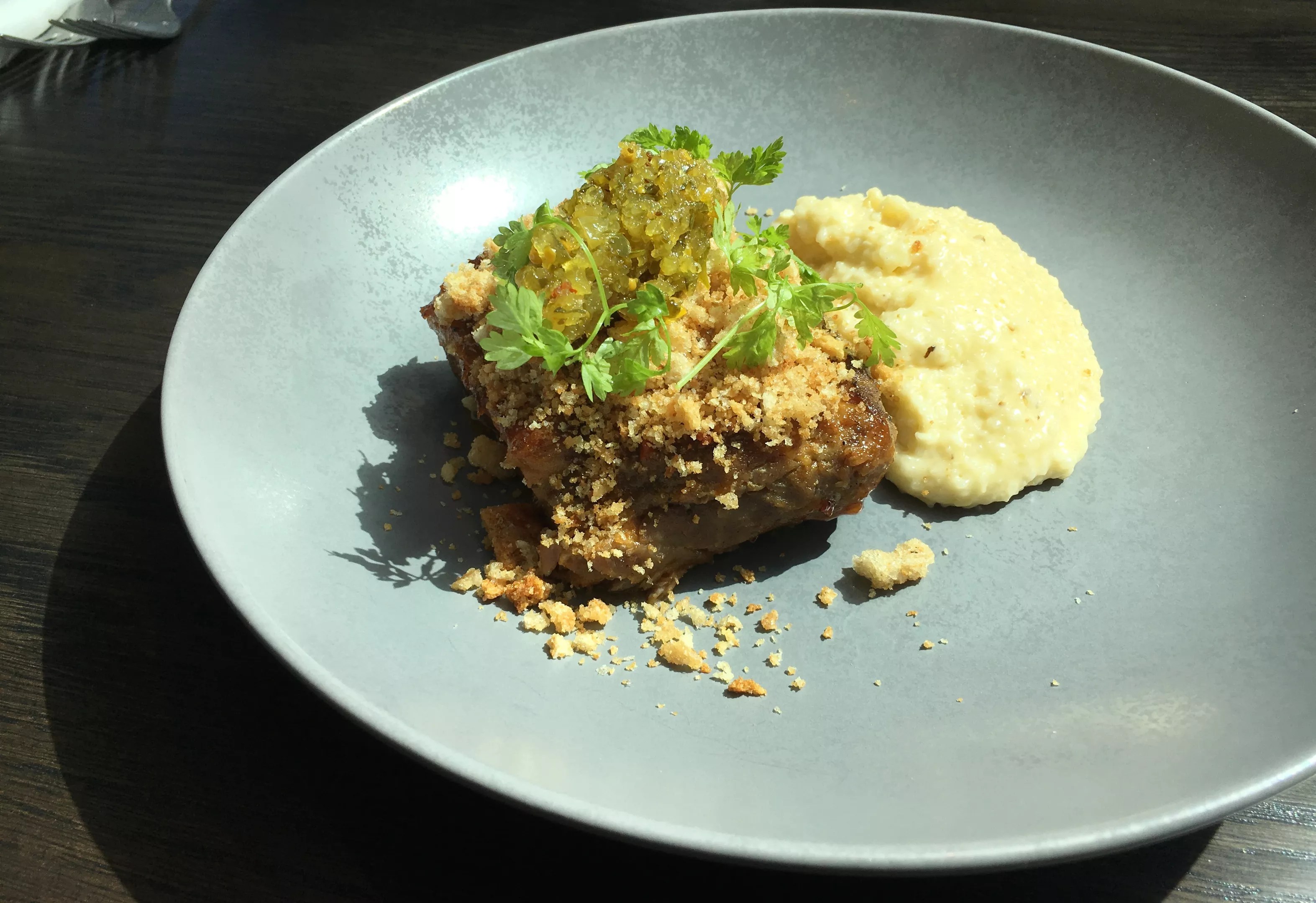 The range of dishes is eclectic, but with a clear focus on regional American cuisine, though Italian influences also crop up. Smoke and fire play an important role, a nod to the building’s firehouse past. For example, an appetizer of cured steelhead trout carries a hint of smoke, and the plate is built to evoke a toasted bagel with lox and cream cheese. And an entree of pork short rib (an uncommon cut that Ruiz says includes the last three ribs on the rack, plus a meaty portion of belly) is also lightly smoked and draws inspiration from North Carolina, with bread and butter pickle relish, Carolina barbecue sauce and cheddar grits.