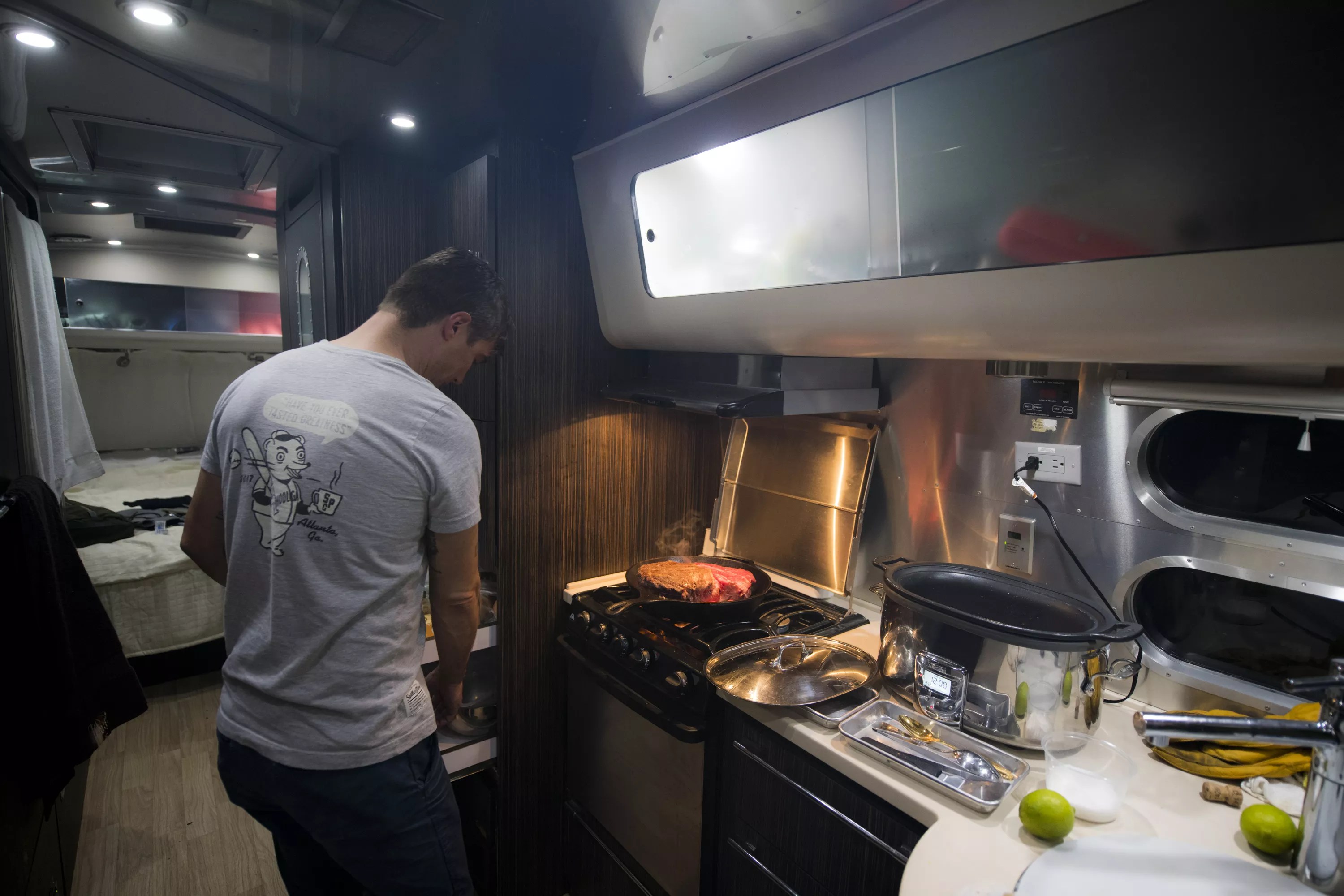 Browning meat in the Airstream before it goes into the slow cooker.