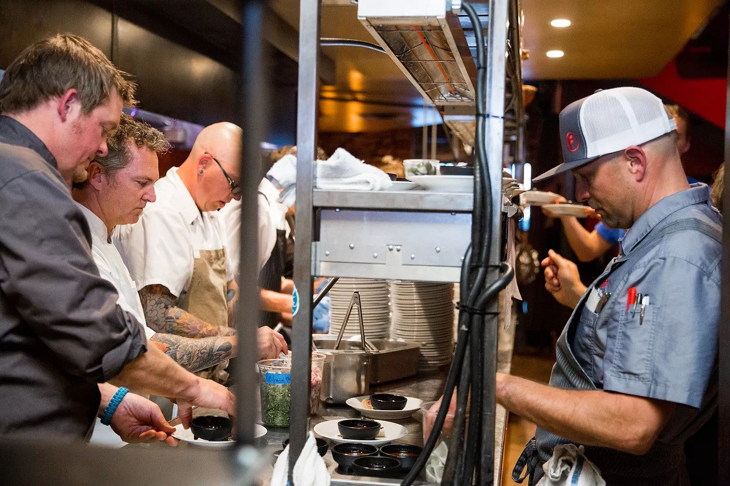From there, the dining scene you see today took shape. Phenomenal humans like Keegan Gerhard and Lisa Bailey, Troy Guard, Alex Seidel, Jeff Osaka and Enrique Socarras were soon added to the mix; there was no equation, and we created brands for ourselves by hustling, working every event and doing every dinner, and we worked that shit to the bone. When there wasn’t a gig, we created our own with dinners for every reason and a few for no reason at all. Together, we started throwing bacchanalian underground dinners called 50 Top, before the term pop-up was even a glint in anyone’s eye. Dinners held in random locations throughout the city brought together the dining community the best way chefs know how: at a big-ass table with more food and drink than you can possibly comprehend. The overall plan was simple: Get people dining out, associate our names with our food and restaurants, and stake our claim. And we did it together. We hashed out plans and then unconditionally supported each other’s every endeavor. That esprit de corps lives on today.