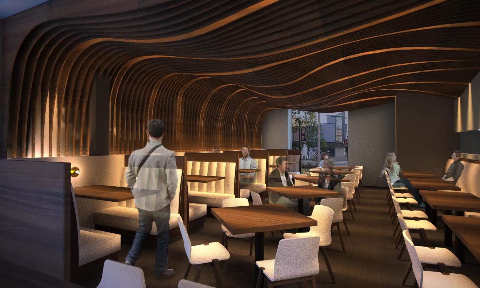 The chef’s vision for Concourse is being brought to life by the LIVstudio design team and Hive Construction. The restaurant will seat nearly 100 guests inside and an additional seventy on two patios. Design elements include an undulating wooden installment that flows from the ceiling and down one wall of the dining room, a fourteen-seat bar clad in luminescent glass tile, a panel of translucent glass separating the kitchen and dining room, and towering wine shelves to display Concourse’s bottle selection, which will be a big focus of the beverage program.