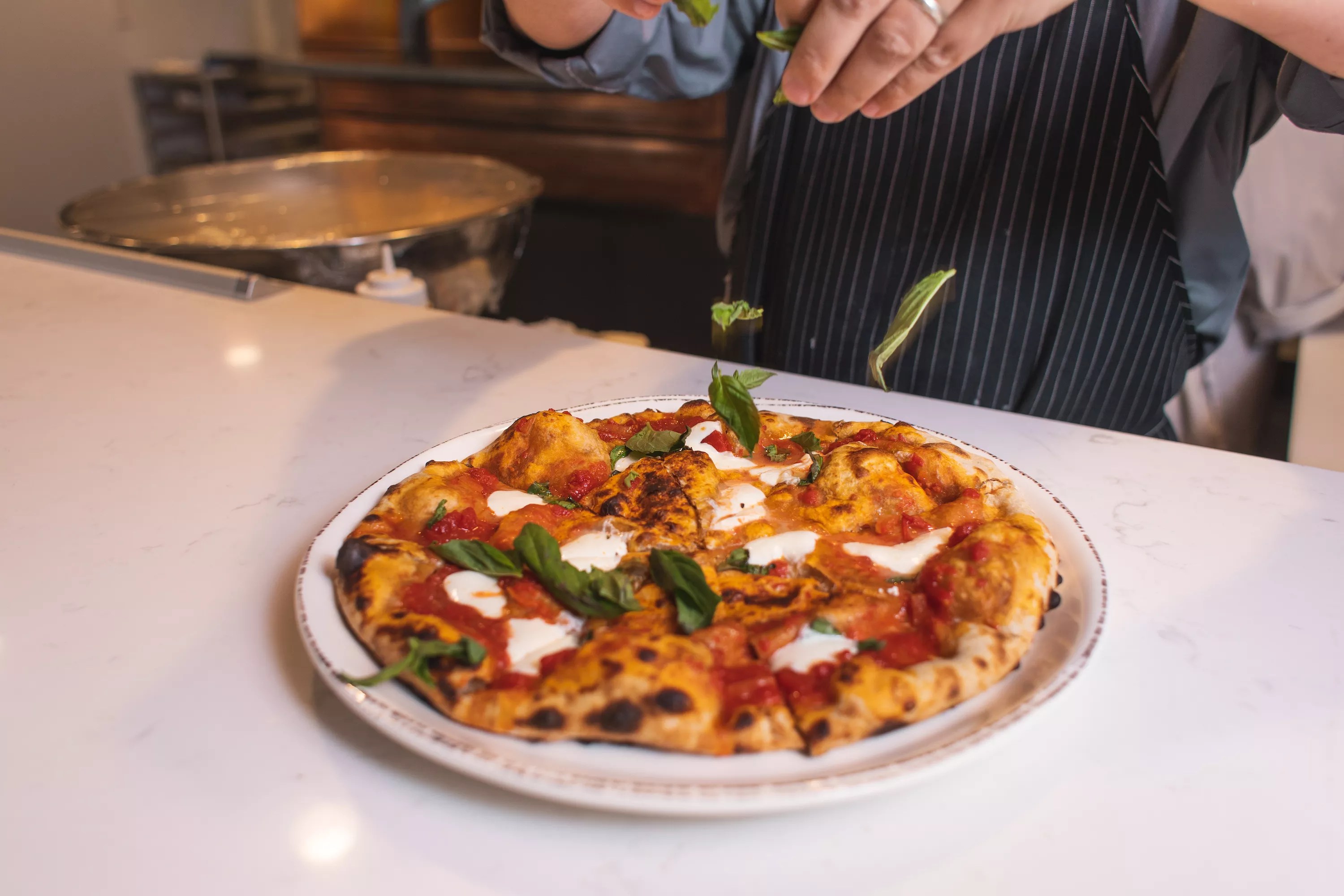 Margherita pizza gets a finishing touch of fresh basil at Gattara Restaurant.