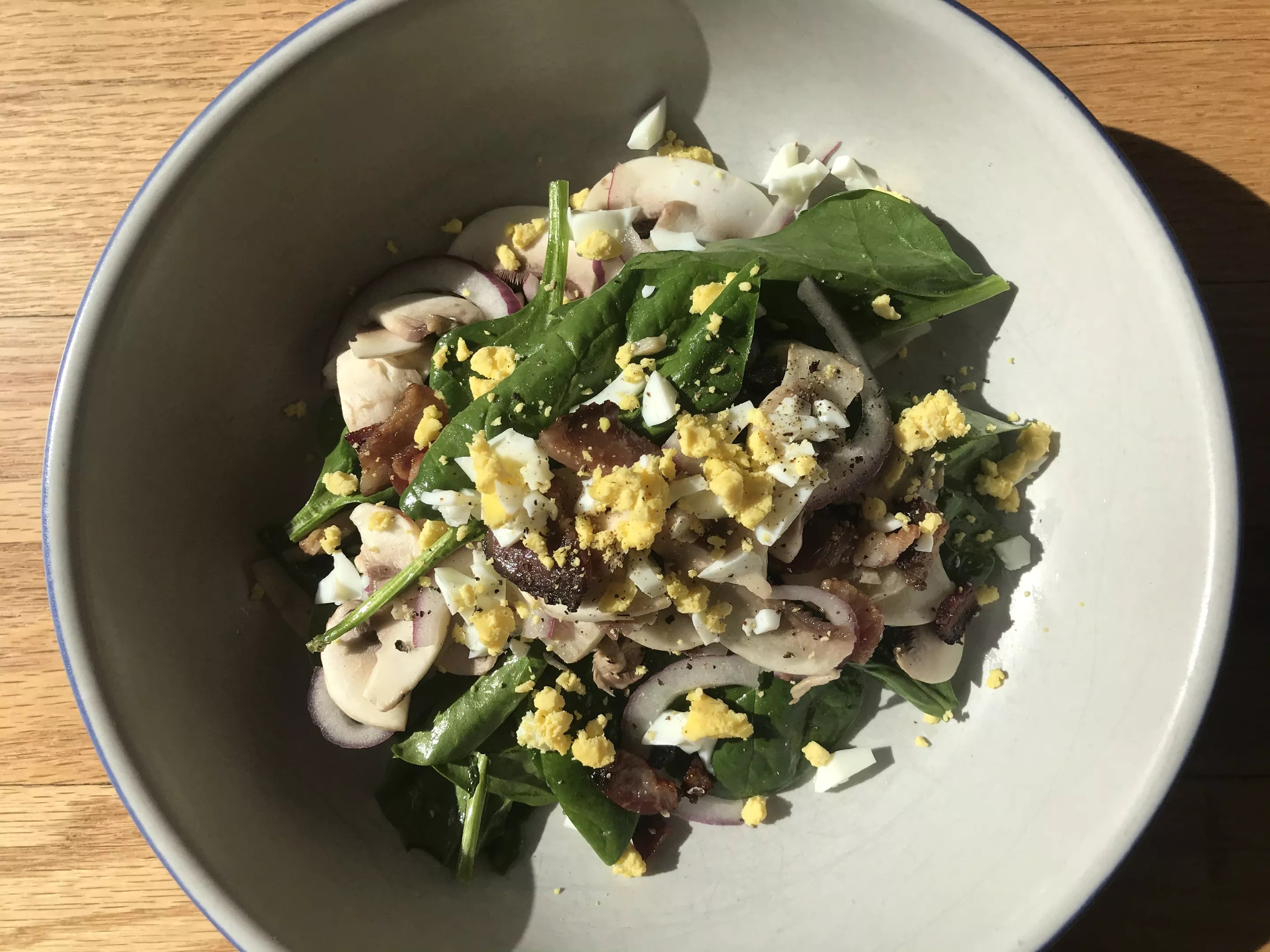 Wash and dry the spinach. Toss the spinach with salt and the hot bacon dressing. Allow heat of dressing to wilt spinach slightly. Toss salad again with reserved bacon pieces and mushrooms. Plate salad. Drain red onion from cold water and top salad with red onion and cooked egg yolk and egg white. Serve immediately.