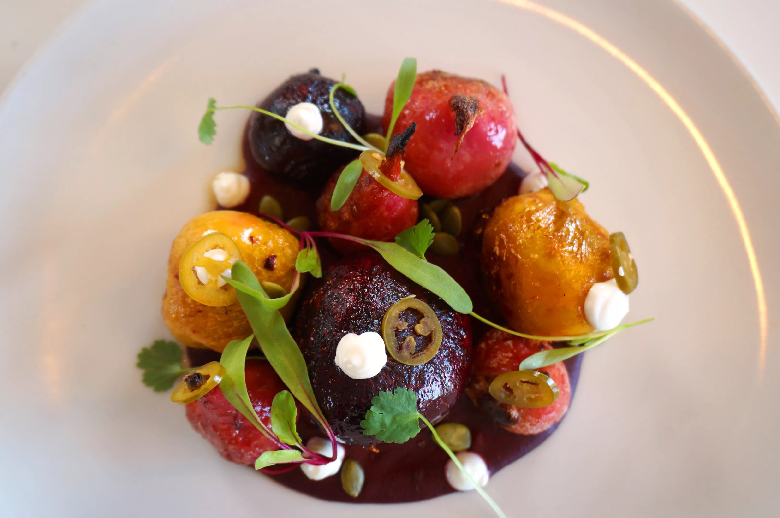 A medley of beets atop beet mole.