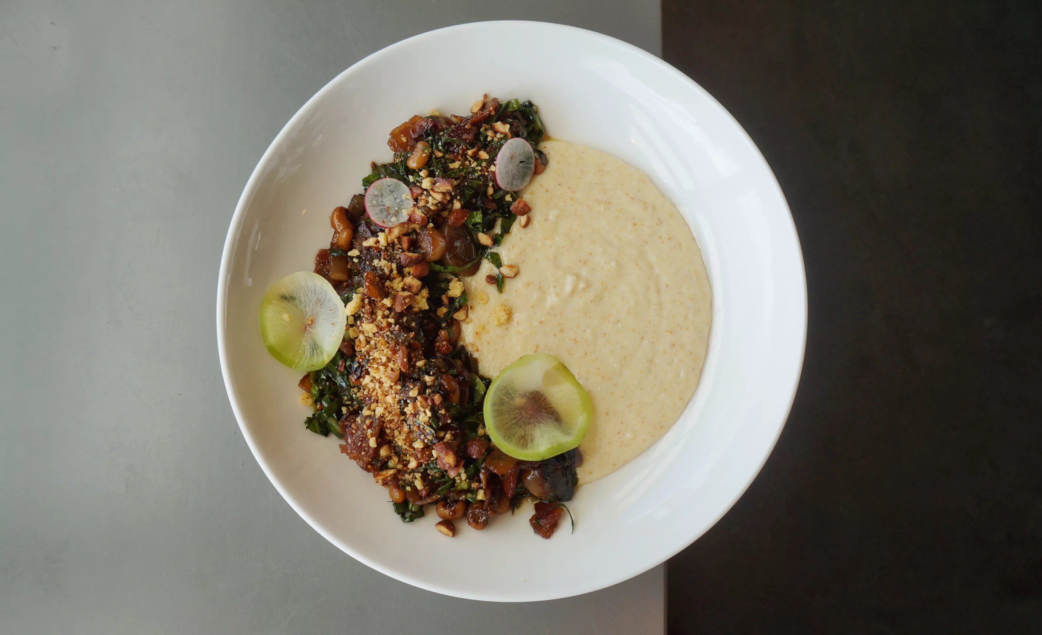 Southern staples get a modern treatment in dishes like a warm collard green salad with black-eyed peas, bacon and onion served over creamed cornbread. Weir-Villatoro uses cornbread trimmings by drying, powdering and puréeing them with cream and butter to create something akin to grits, but with a smoother, richer texture and a distinct home-baked flavor.