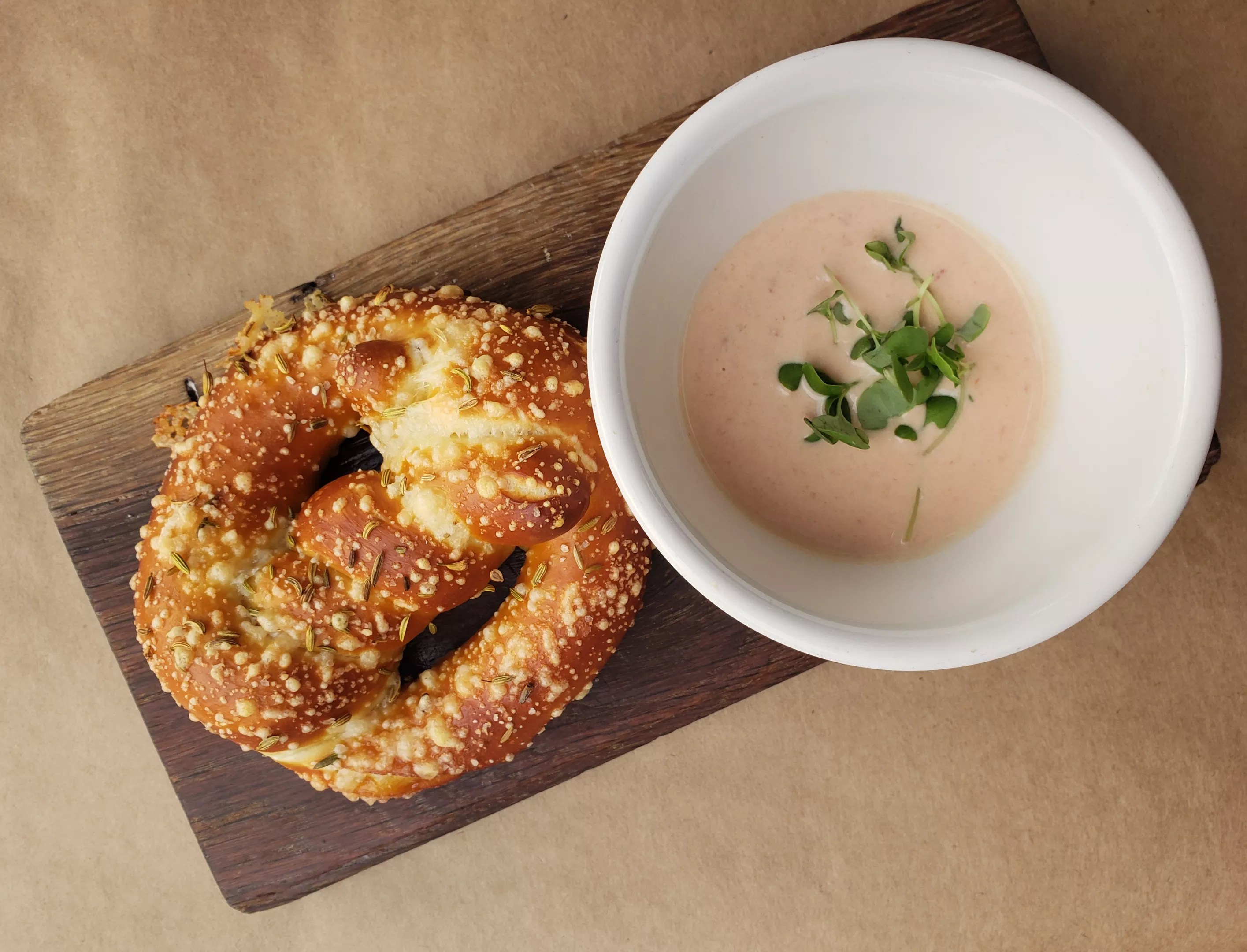 A parmesan pretel with tomato fondue.