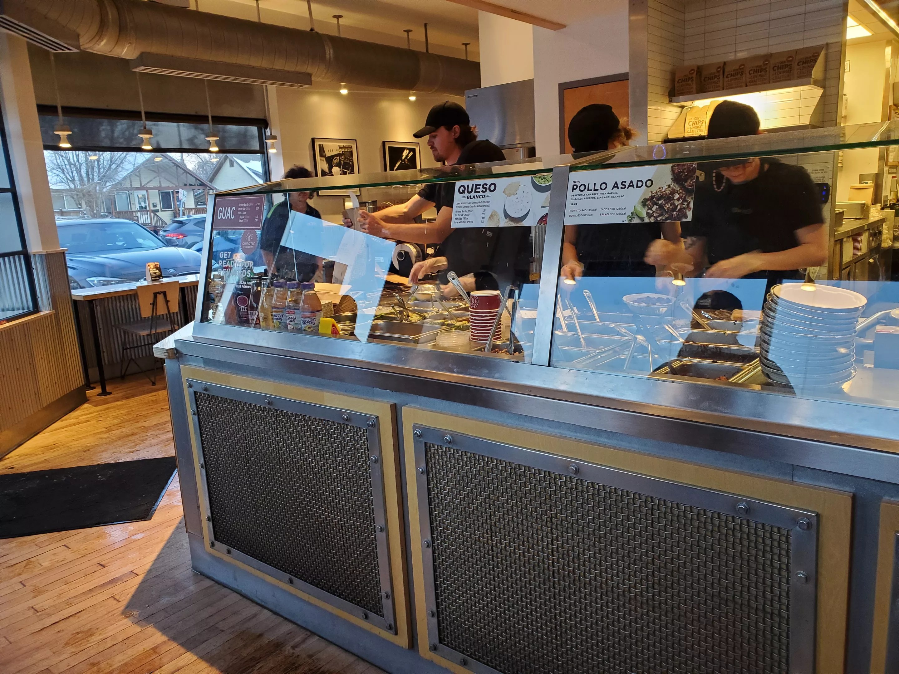 While the OG Chipotle was once known for its edgy industrial decor and indie playlist, it’s now a pretty bare- bones corporate box. The small location is a table-less machine, churning out burrito after bowl after taco in a flurry of flying lettuce and spilled salsa. The staff was on edge when I dropped in – and rightfully so, considering the line that grew nearly as fast as the pile of online order tickets that kept stacking up.