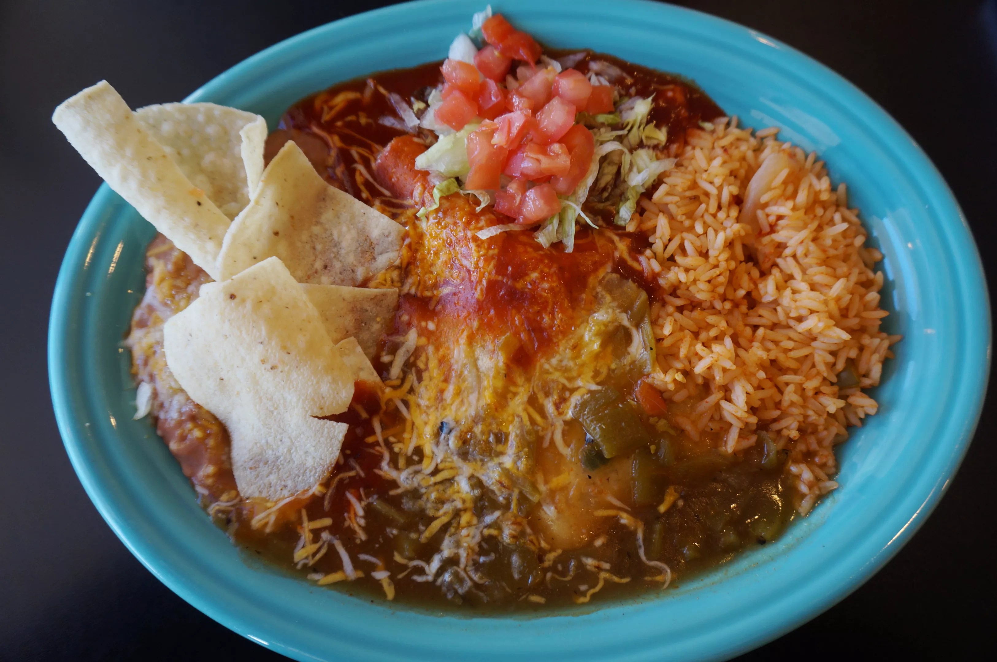 For just $9, the lunchtime enchilada plate comes with two enchiladas, beans, rice and salad. Shredded beef is an excellent choice, but you can also get steak for an additional $3. Ordering the plate Christmas-style results in side-by-side enchiladas robed in two distinct sauces: a mild red with the slightly toasty flavor of dried chiles, and a smooth green that falls more into the salsa verde category than chunkier Southwestern green chile. It’s a satisfying lunch (especially with a free basket of chips and salsa), but it’s probably not the kind of Christmas that a New Mexico transplant is expecting.