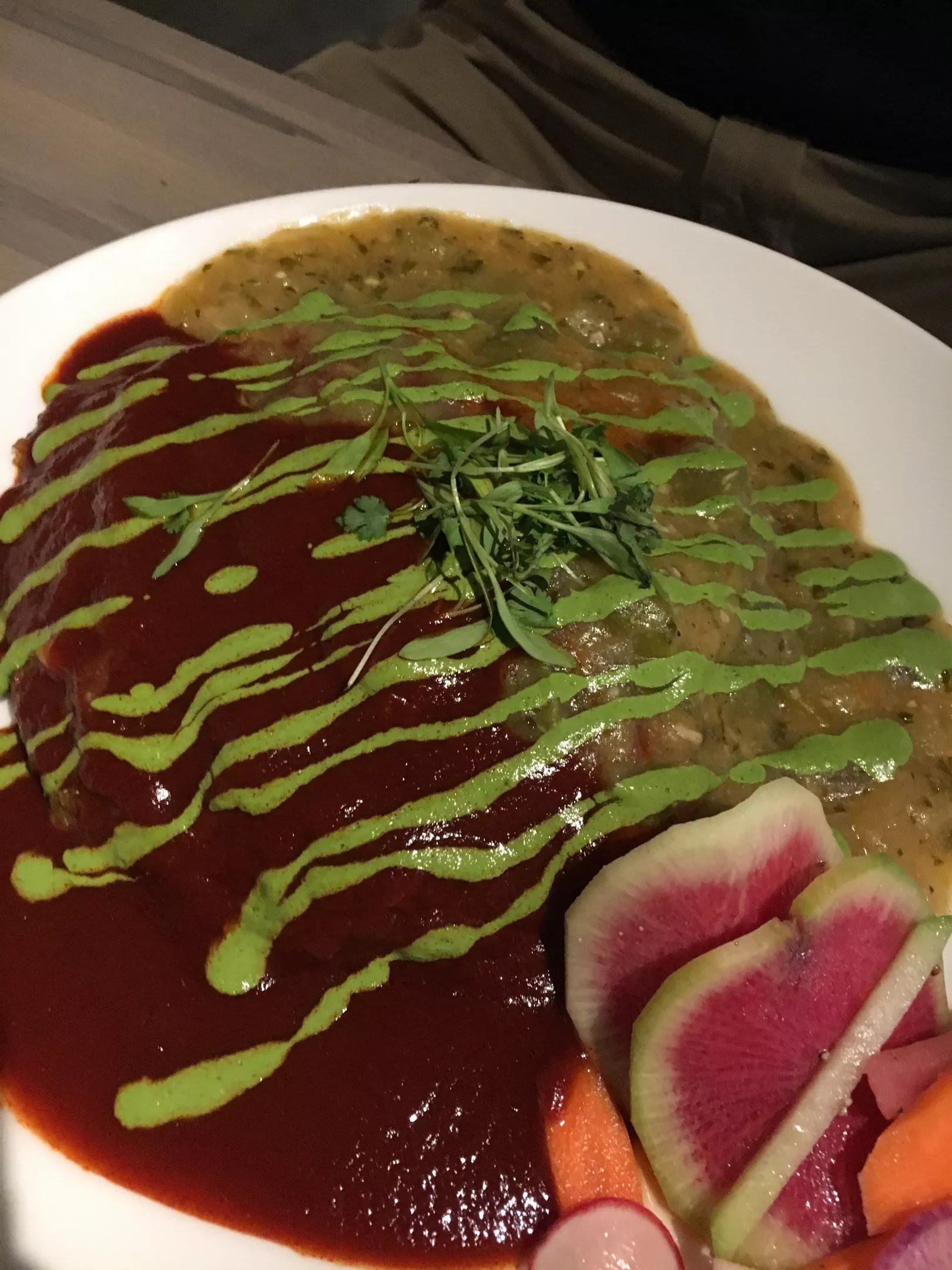 The combination of the two sauces on one dish – stacked blue-corn enchiladas, say, or Navajo fry bread – provide alternating hits of smoky, earthy red chiles and bright, grassy green chiles that register as eye-opening but not painful on the heat scale. And where they bleed together at the center of the plate, something magical happens as an entirely new sauce is created.