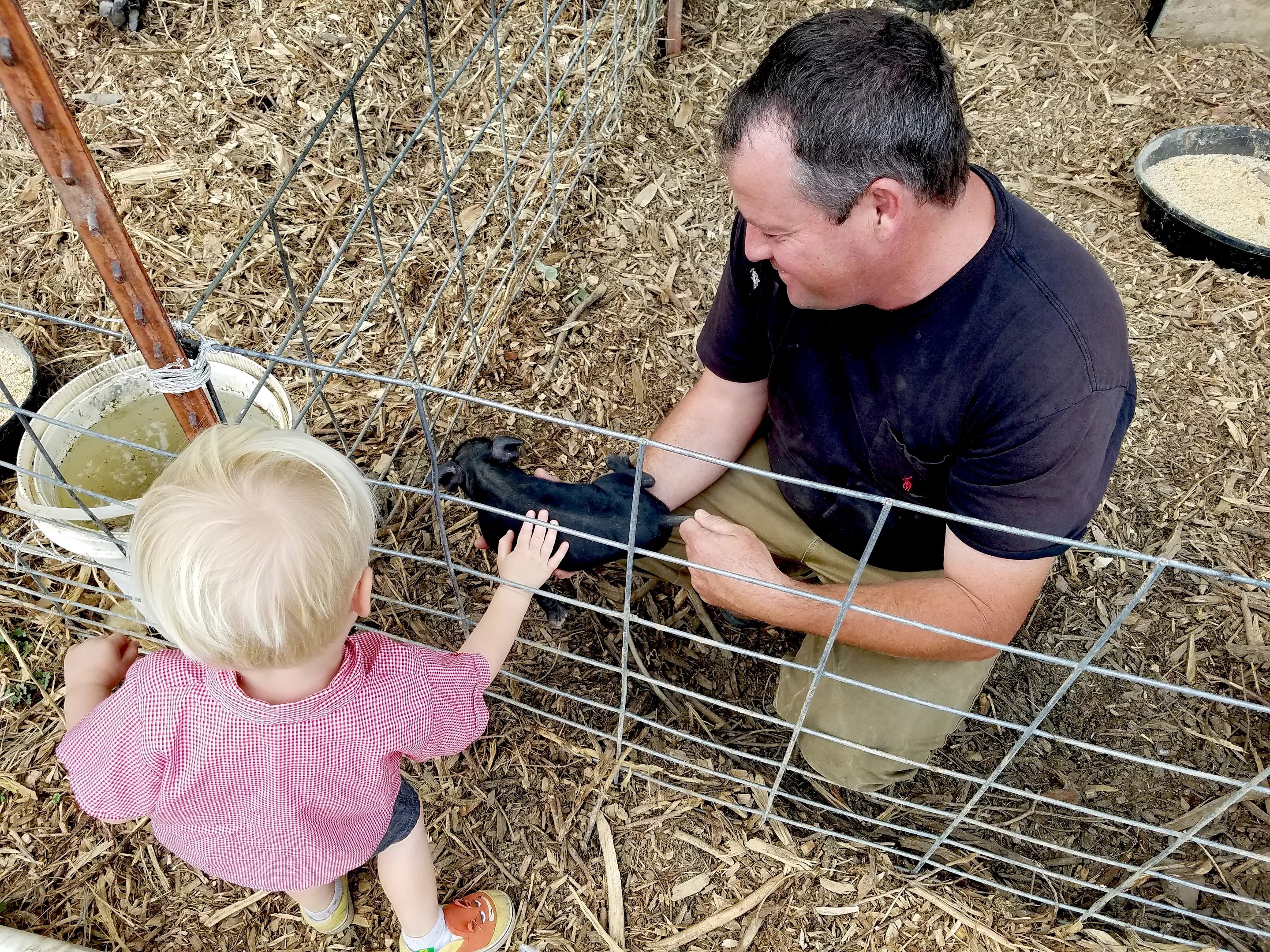 Chef and farmer Eric Skokan shows Gunnar a baby pig up close. Full-grown hogs also help maintain the soil by turning and fertilizing it.
