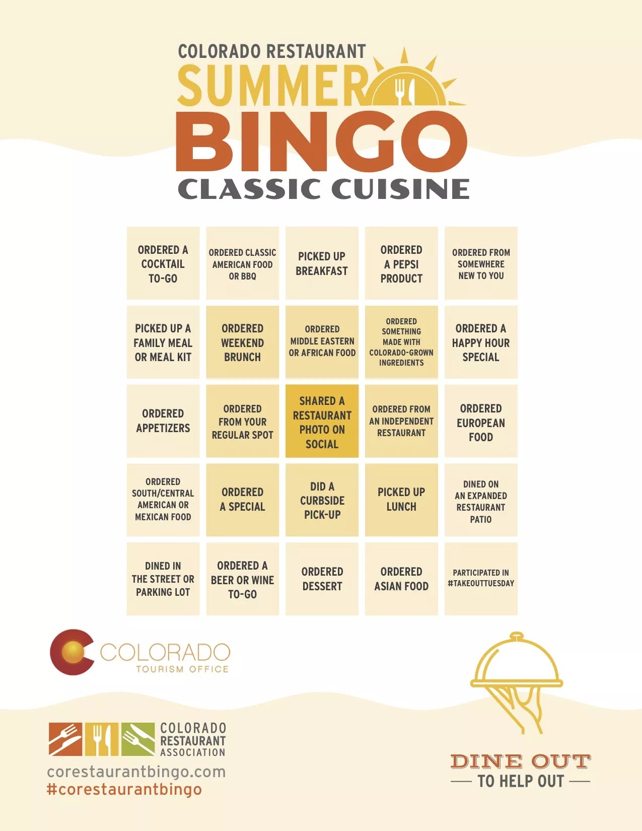 This weekend marks the official beginning of summer, and restaurants and bars are counting on you to come out and grab some grub, quaff some cocktails and have some summer fun – whether you choose to do so at a safe distance through takeout and delivery orders or hit one of Denver’s newly expanded patios for some outdoor dining. The Colorado Restaurant Association and the Colorado Tourism Office want to reward you for helping the hospitality industry through a tough time – with a game of bingo and a chance at prizes.