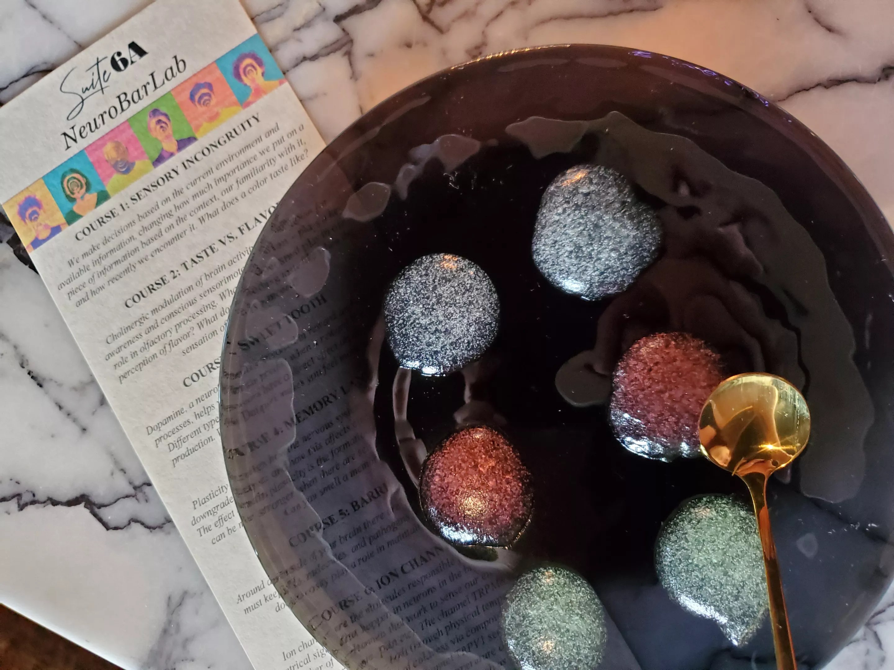 The Neuro Bar Lab experience kicks off with Death & Co’s take on a Jell-O shot – though you won’t find any paper cups here. Instead, a trio of different-colored blobs of boozy gel come on a plate, to be scooped up with a spoon. Guests are instructed to taste one at a time and discuss the differences, sparking a spirited debate as everyone shares guesses about the flavors. (No spoilers here.)