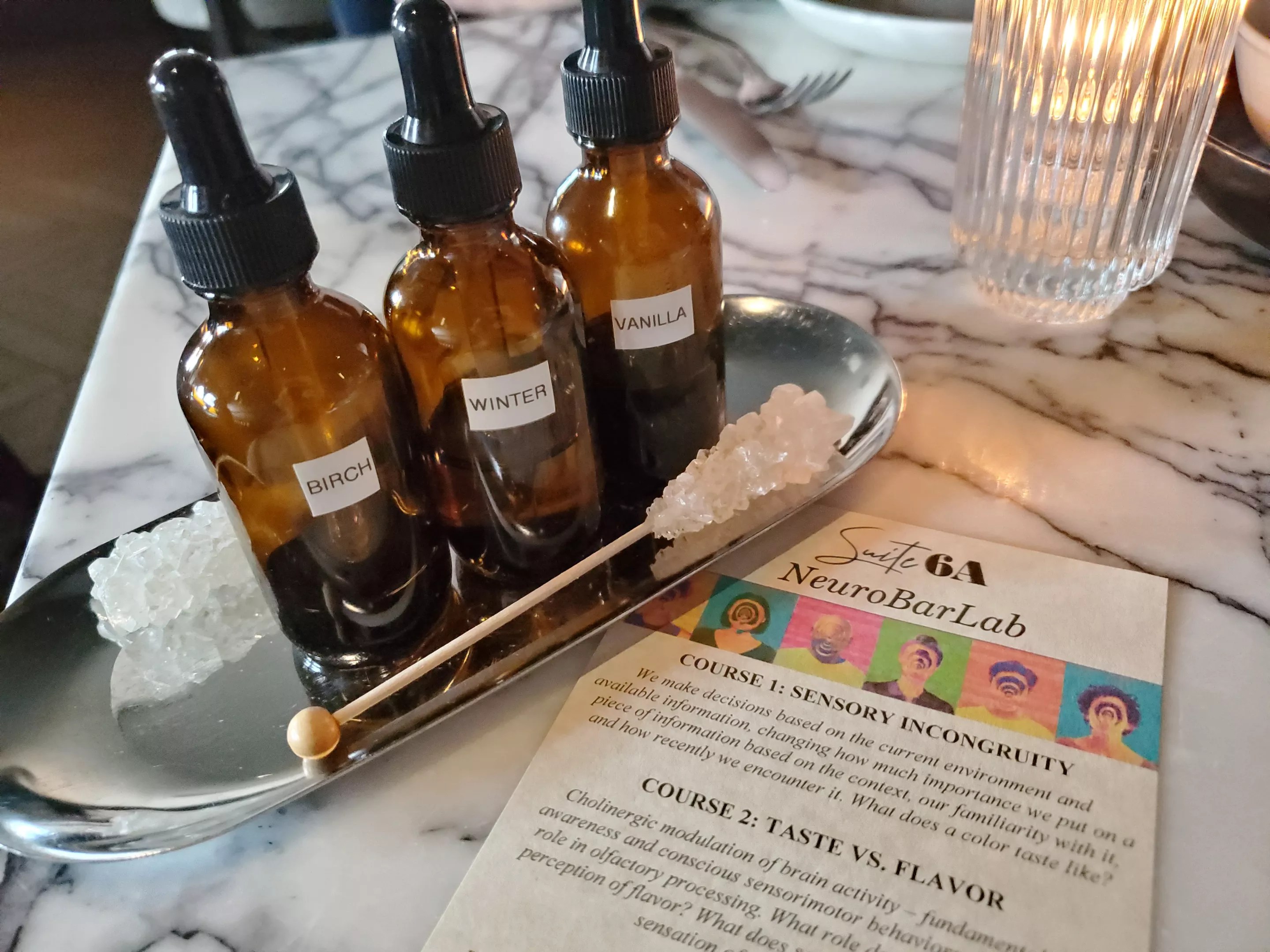 As the evening progresses, there are jars with droppers that you use to change the flavor profile of one cocktail, while one small ingredient difference in a duo of otherwise identical libations affects their flavor.