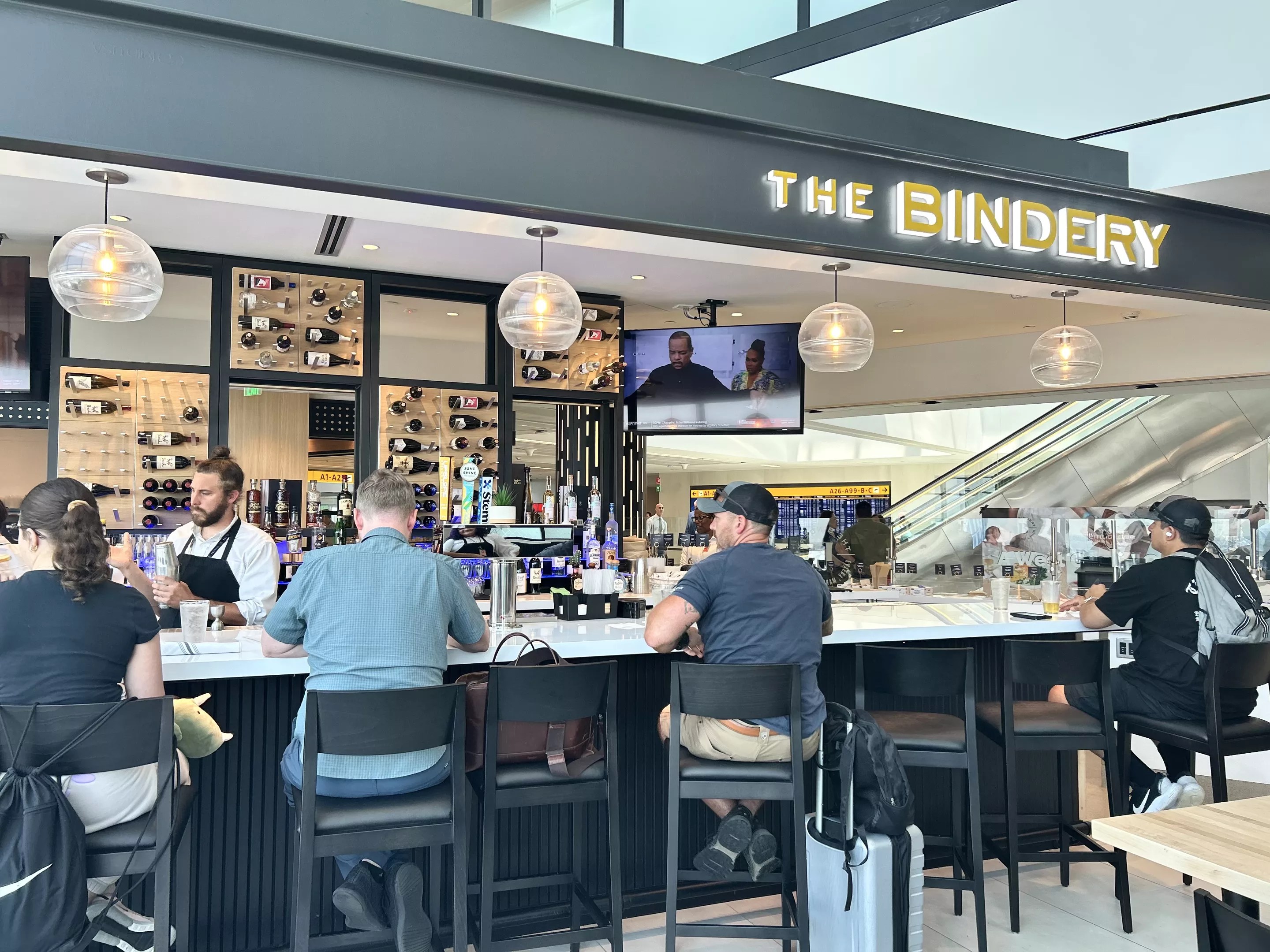 The Bindery offers upscale new American fare and the airport’s only oyster bar.