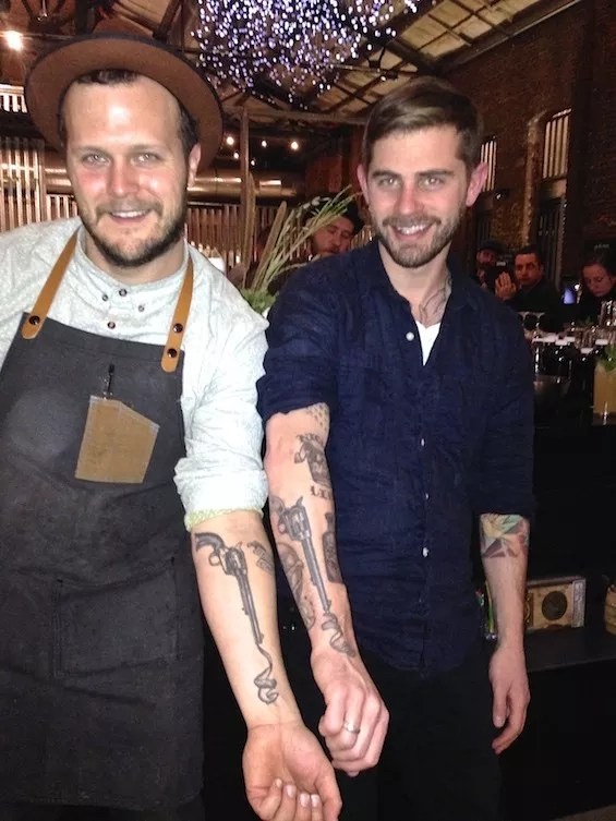 At a 2014 RiNo Yacht Club event, McLain Hedges (left) and Death & Company owner David Kaplan show off identical tattoos, taken from Death & Company’s whiskey menu.