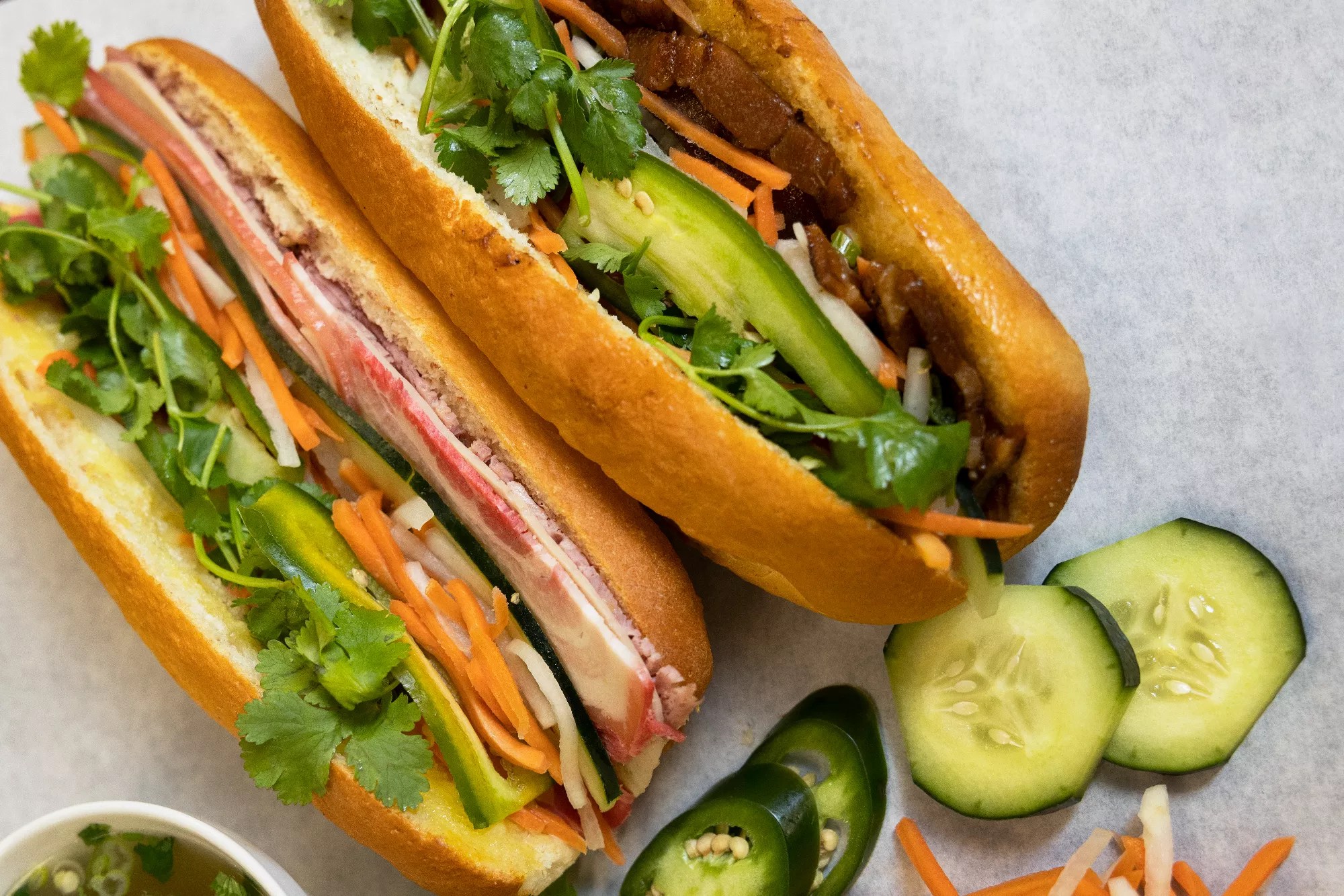 But Thoa makes a different argument: A bánh mì is defined by its taste profile. “Whatever’s on the outside or inside, are you sticking true to the heat, the acidity and the marination of the meat?” she asks.