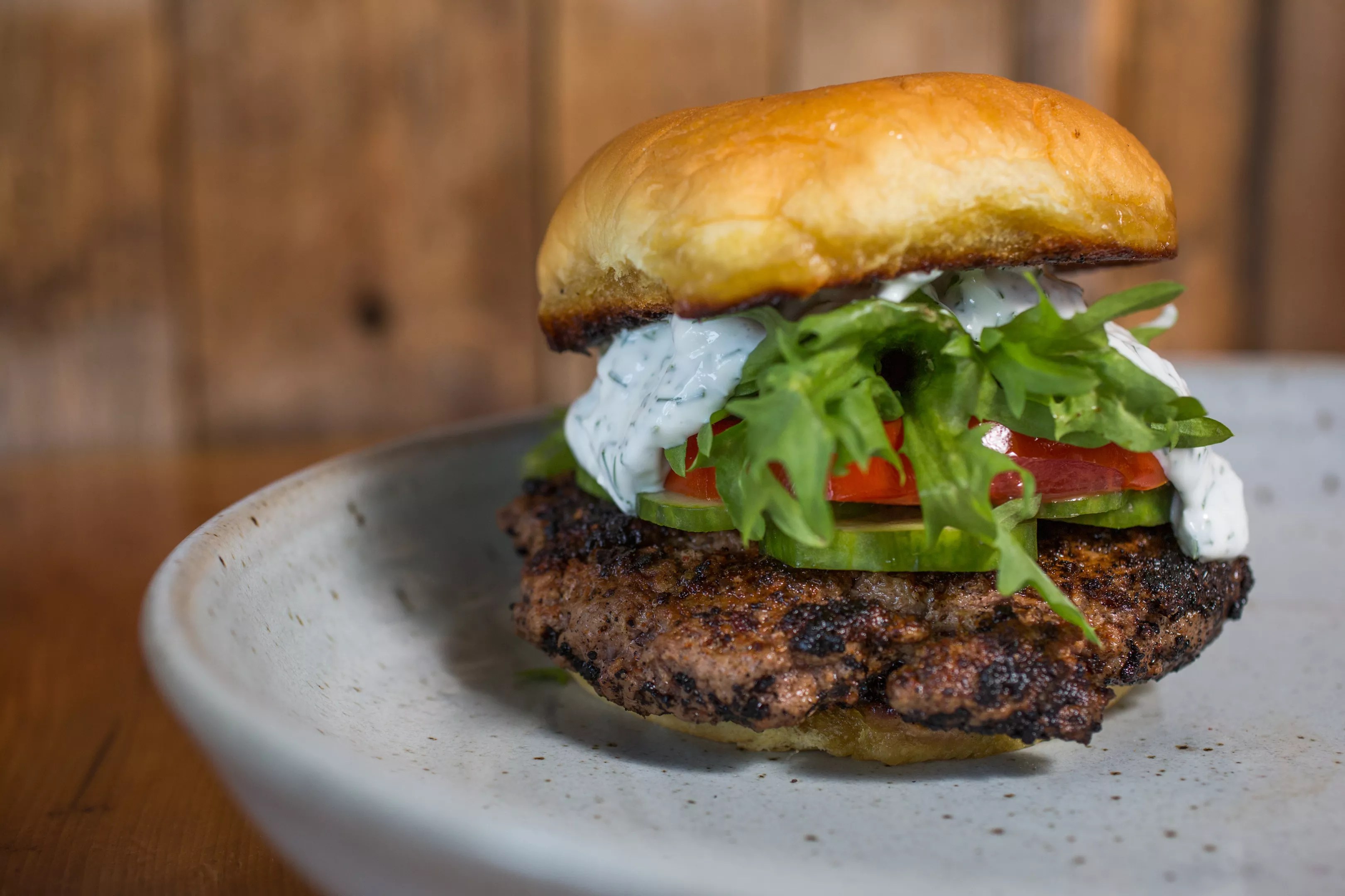 Old Major’s flavorful Blended Burger offering: lamb, creminis, harissa and tzatziki.