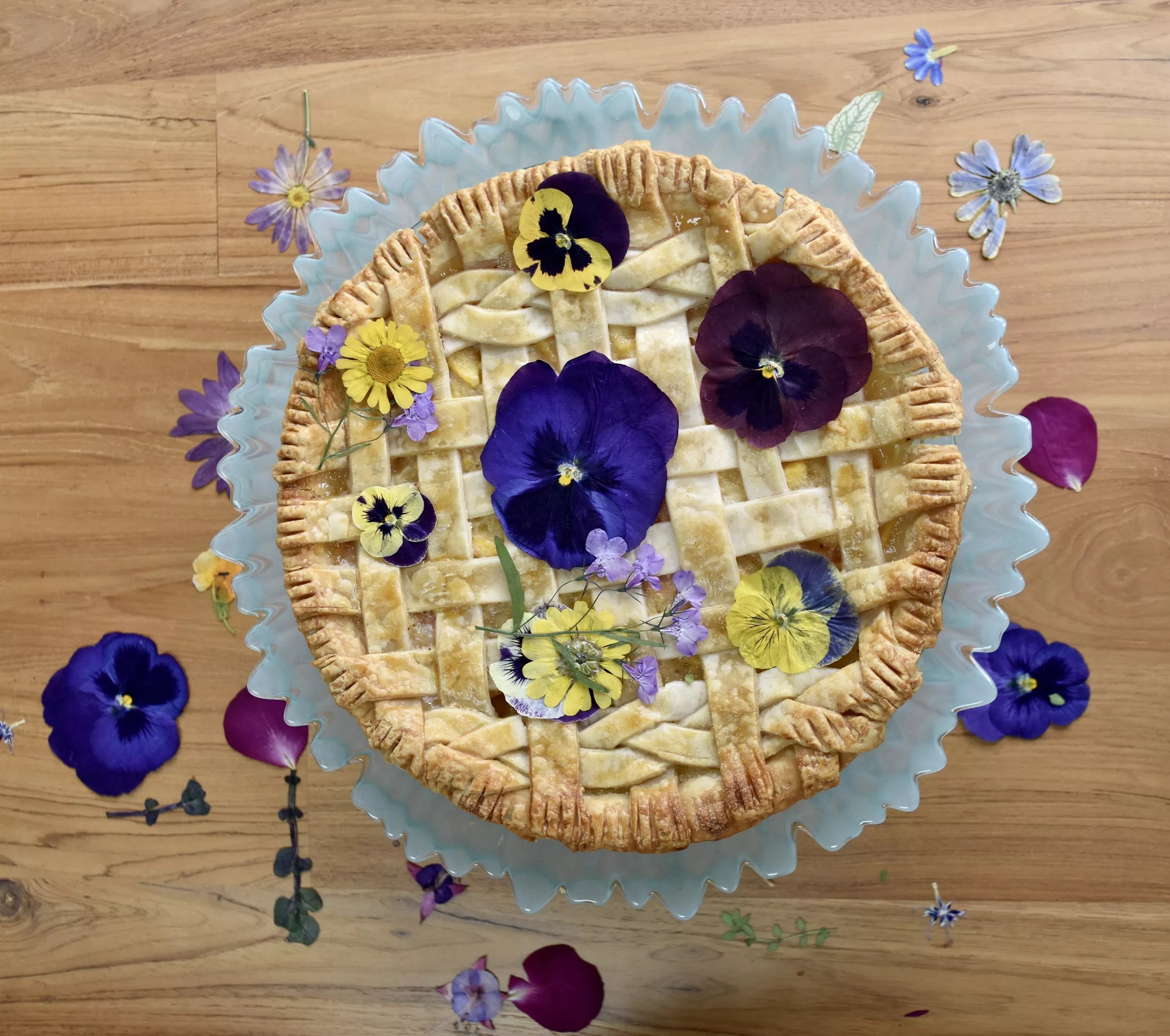 She was inspired to bring together the two places she so loved by incorporating herbs and blooms into her baking. “The first thing I started baking with was lavender,” she recalls. “Then I started doing more research into edible flowers that you can eat whole. One that’s surprising to a lot of people is pansies. … I would press pansies from my garden on pies or put them fresh on cookies.” She developed what has become her signature recipe: shortbread cookies made with lavender oil and decorated with pansies.