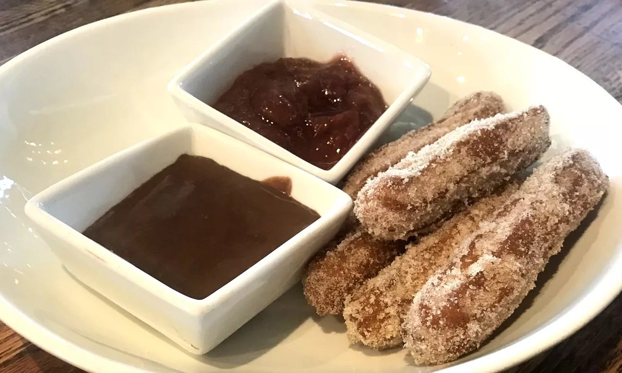 Churros with chocolate dipping sauce and strawberry-rhubarb jam.