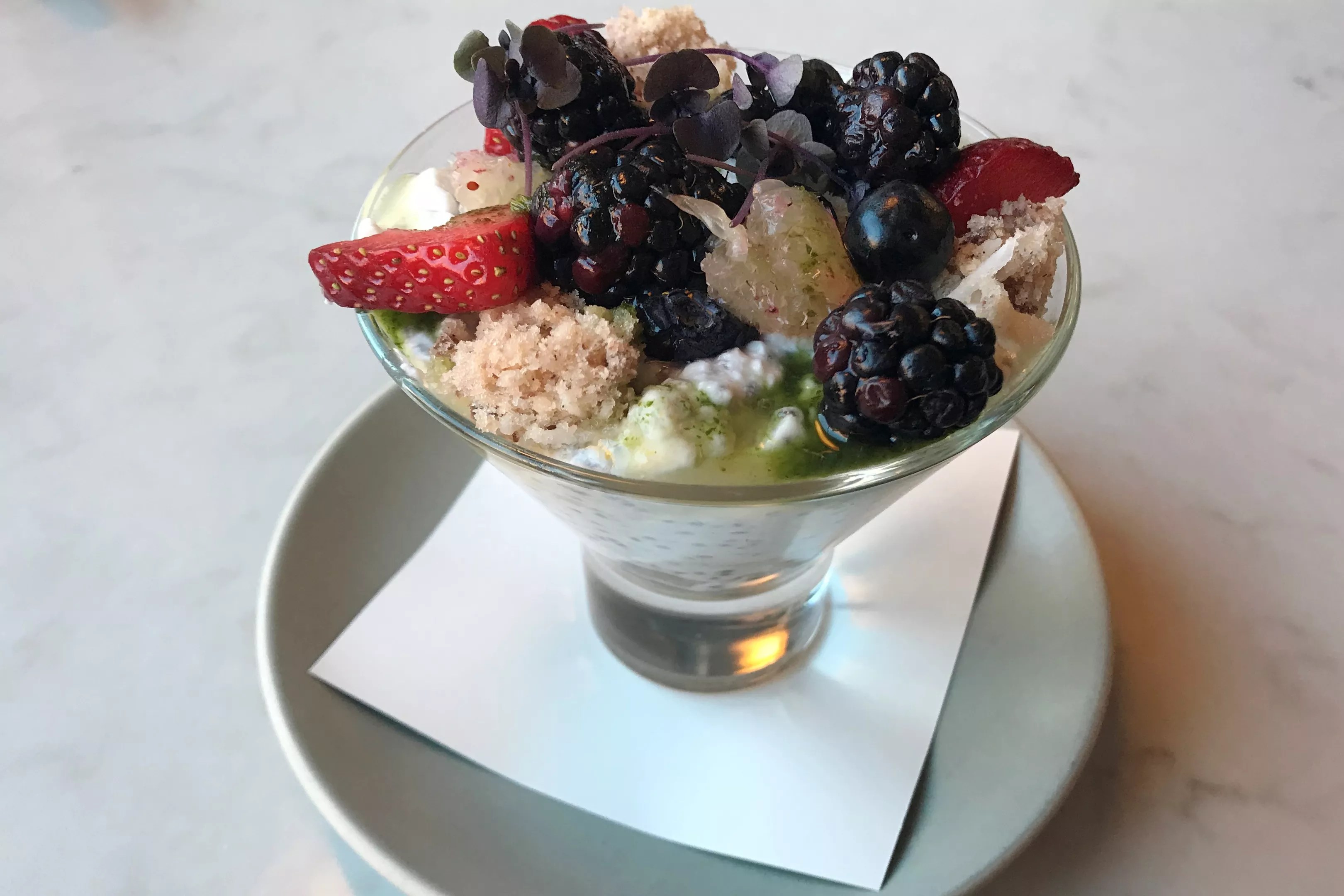 To balance out the sweet French toast, I also tried the duck confit hash, which comes with sliced fingerling potatoes and huge pieces of slow-cooked duck beautifully plated and accented with egg yolk gastrique. If you want to be really healthy, you can try the coconut and chia-seed parfait with mint leaves and fresh berries on top.