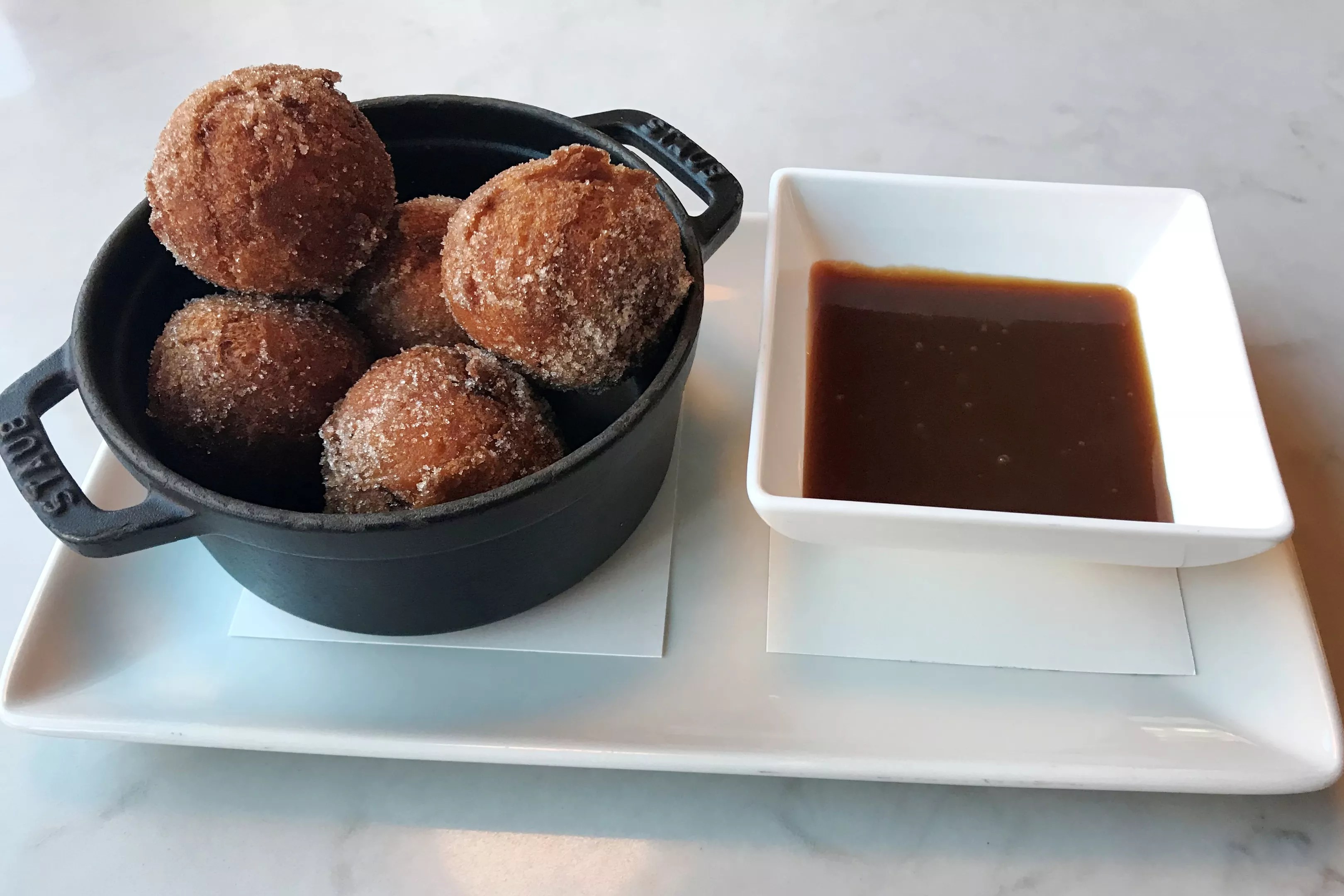 Since the restaurant is attached to a hotel, it’s open early every day of the week, so brunch can be enjoyed at any time, in case you don’t want to brave the weekend crowds. I stuck with tradition on a weekend visit, though, sampling a few different dishes and drinks. I started my brunch with a seasonal sweet treat: pumpkin doughnut holes with a side of rich and creamy caramel sauce. The flavors of these deep-fried treats rotate, so if you miss out on pumpkin, something else will soon be a tempting replacement.