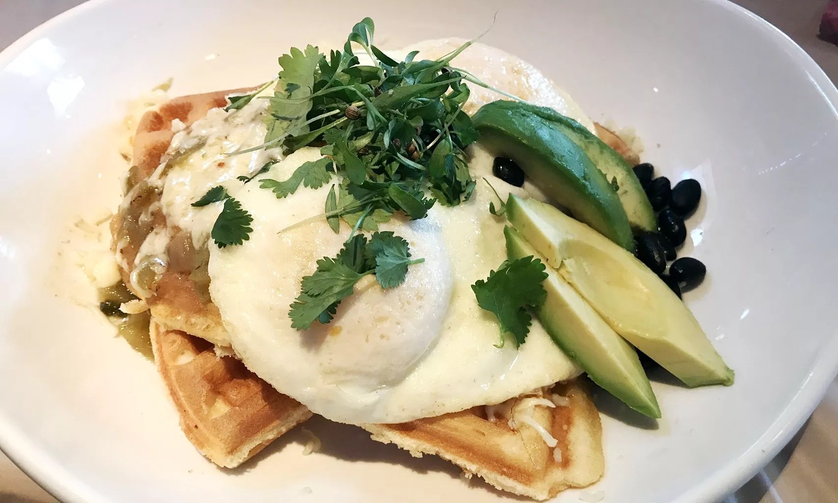 The Ungrateful Boss is a new dish that combines waffles with Southwestern ingredients in a satisfying way. Crisp-edged waffles come topped with black beans, housemade green chile, cheese, avocado, two fried eggs and cilantro. Other movie-themed dishes this week included the Embezzlement breakfast sandwich and the Skinny and Sweet Benedict.