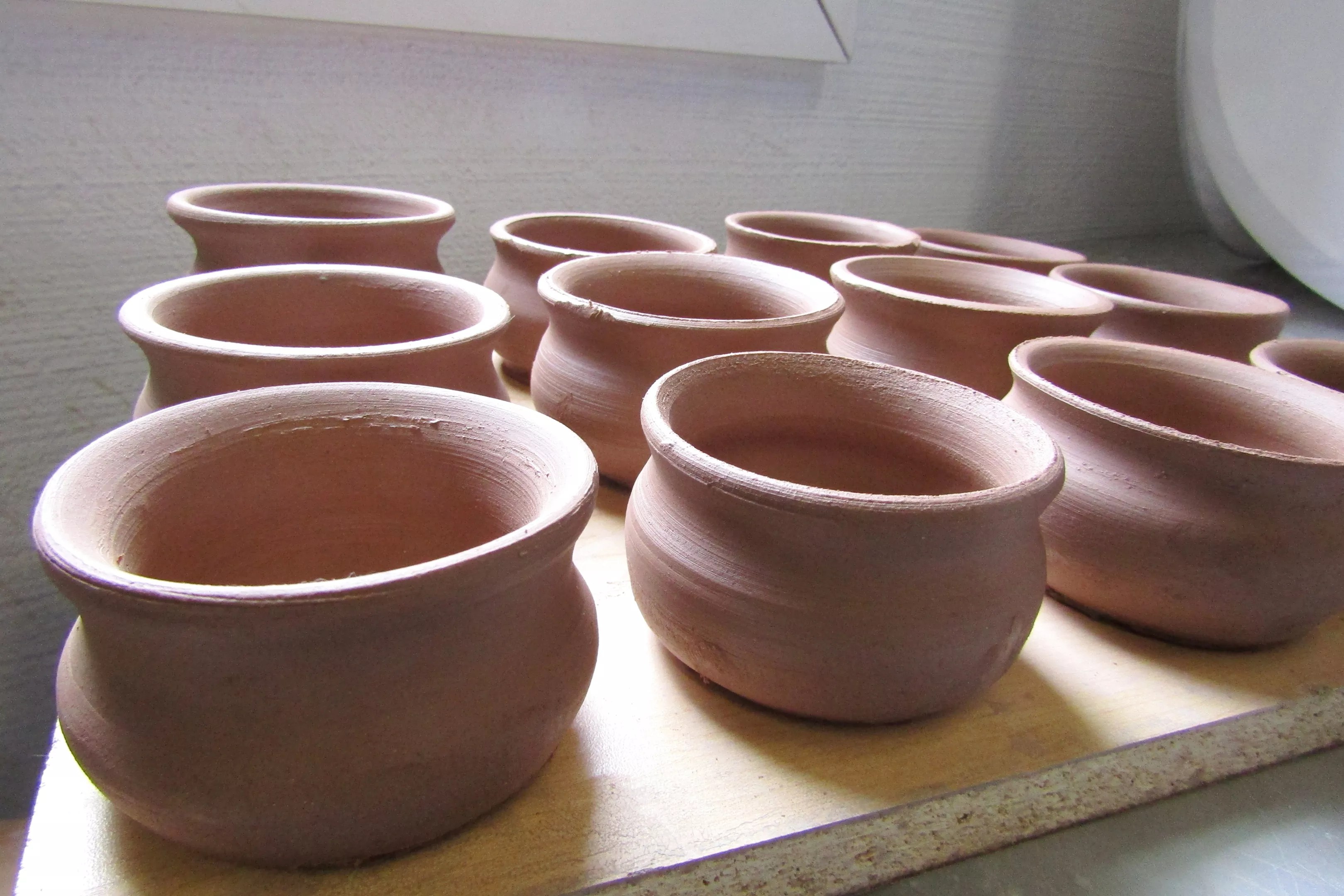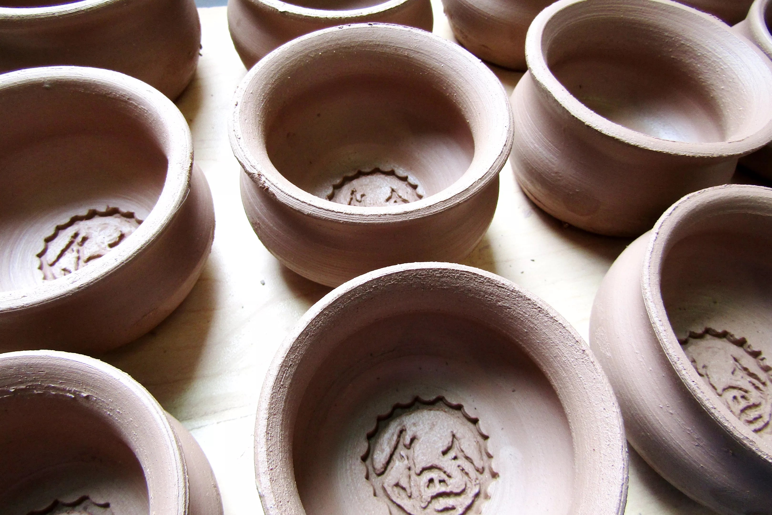 Clay cups await glazing and firing before being delivered to Cochino Taco.