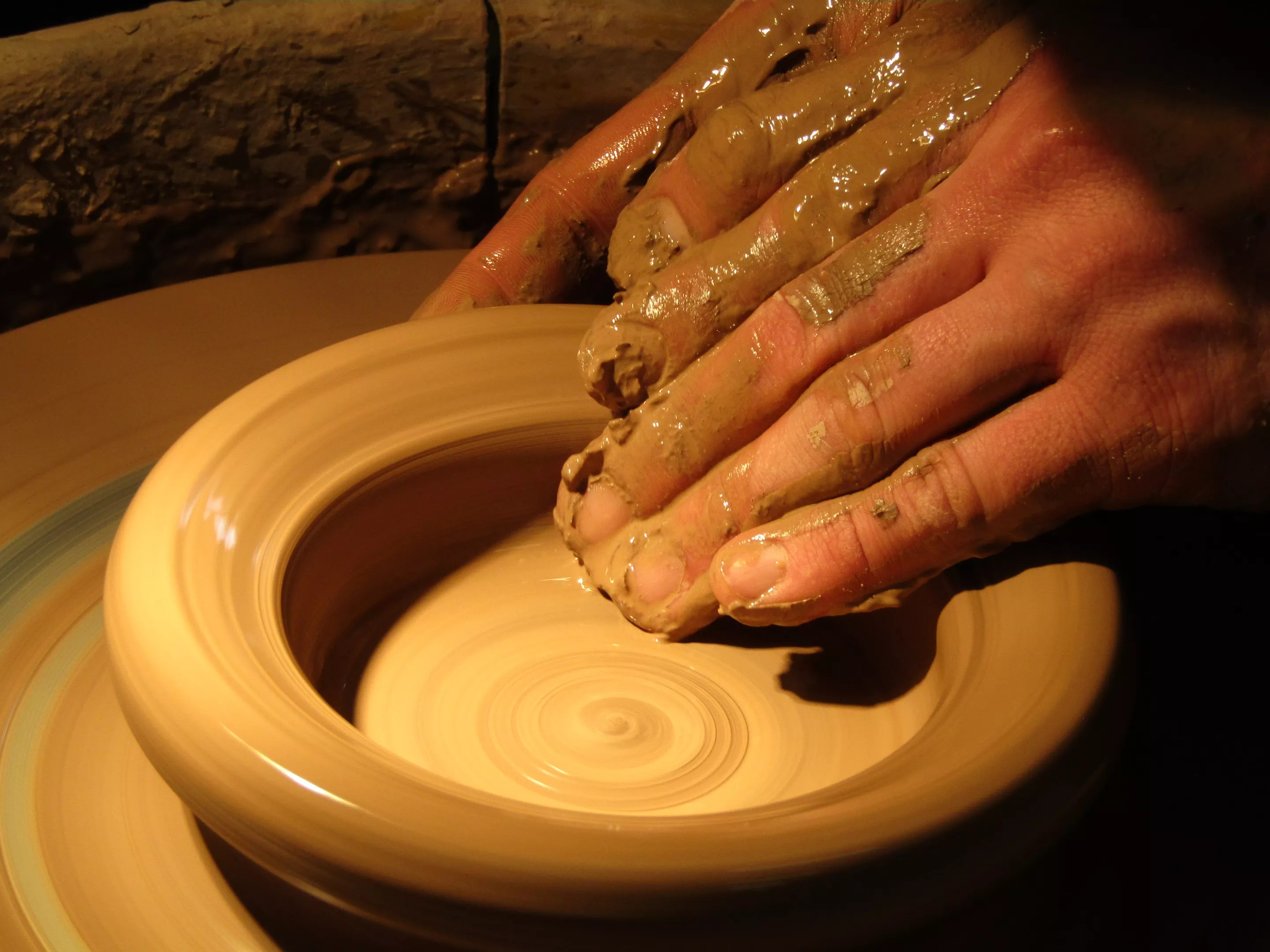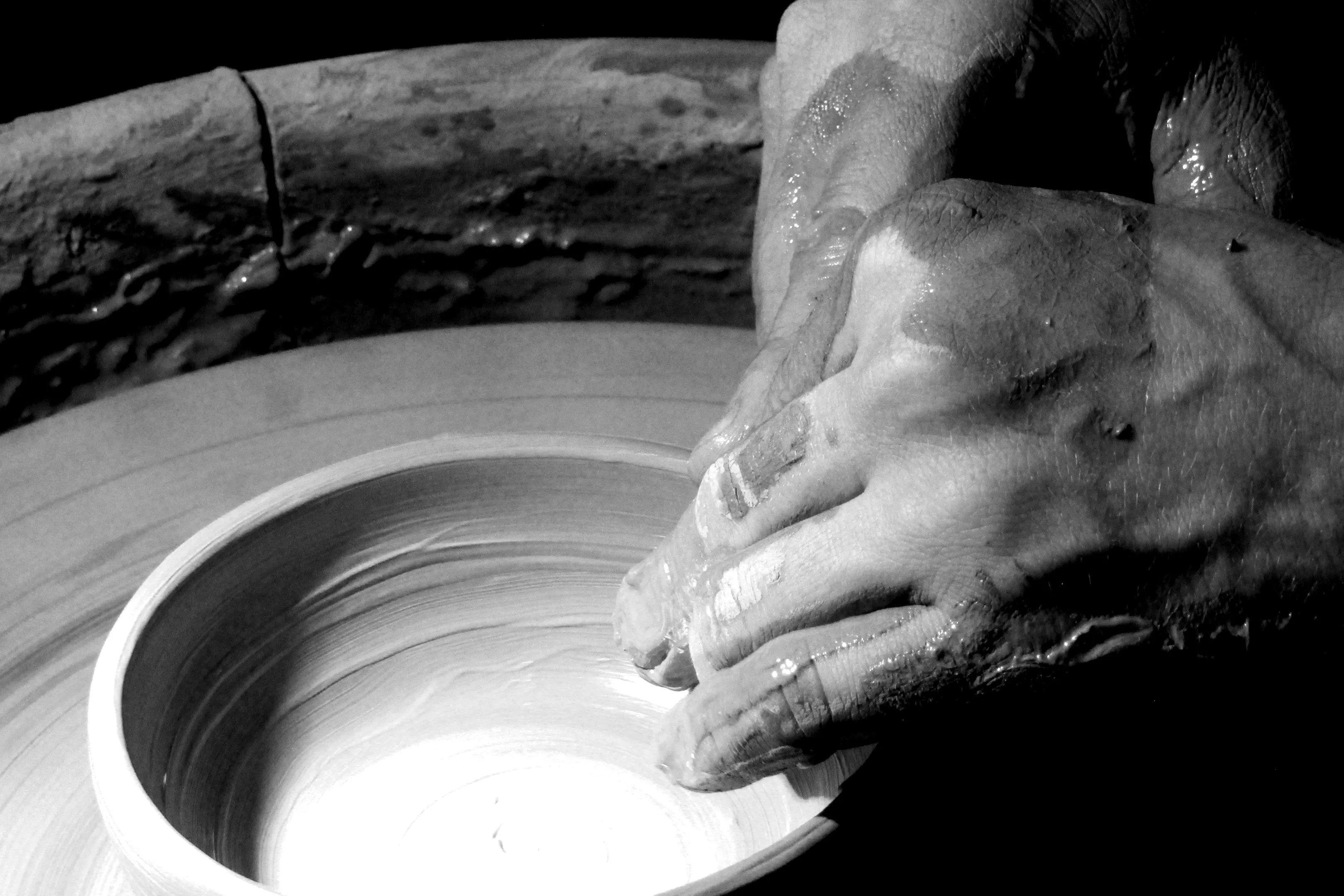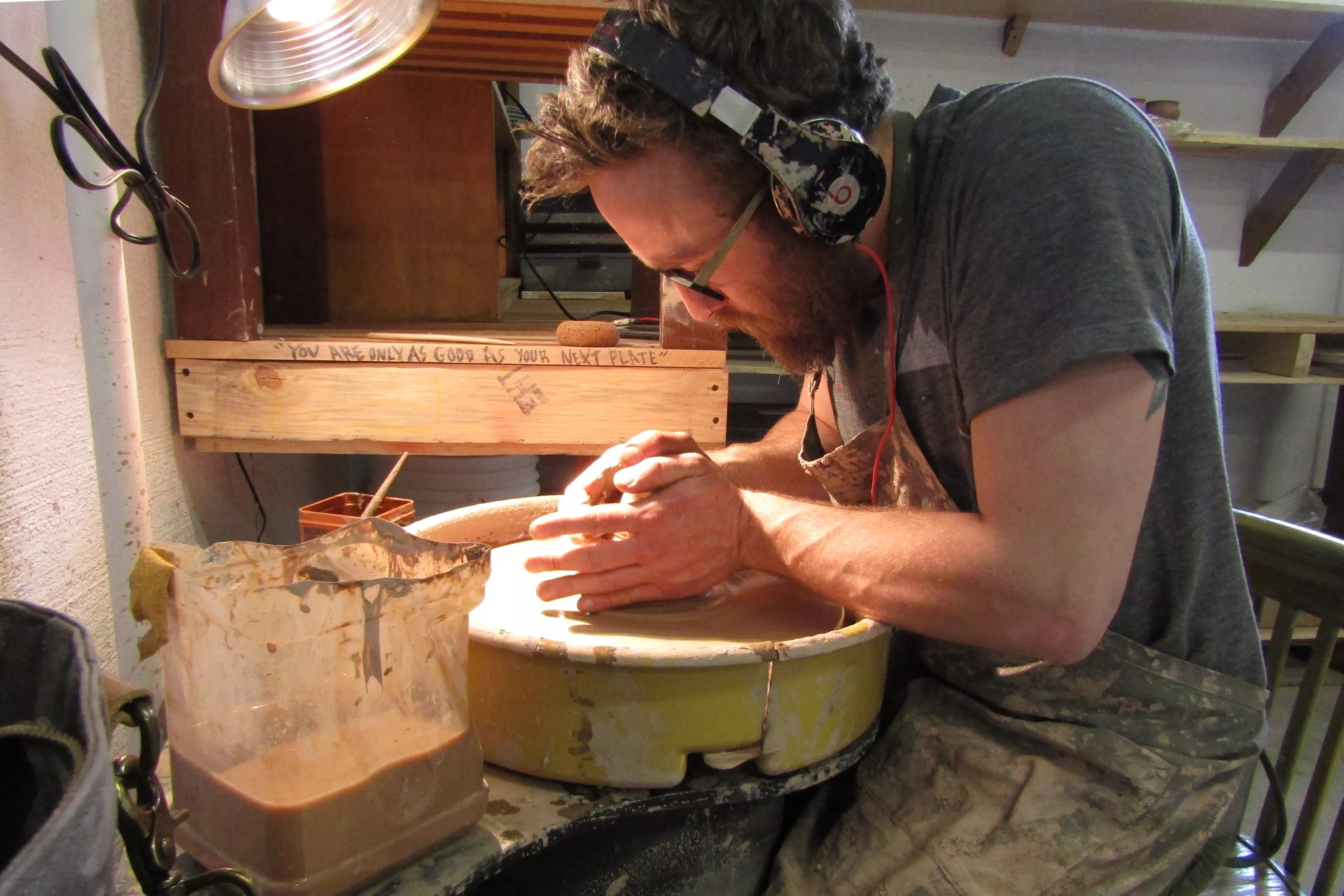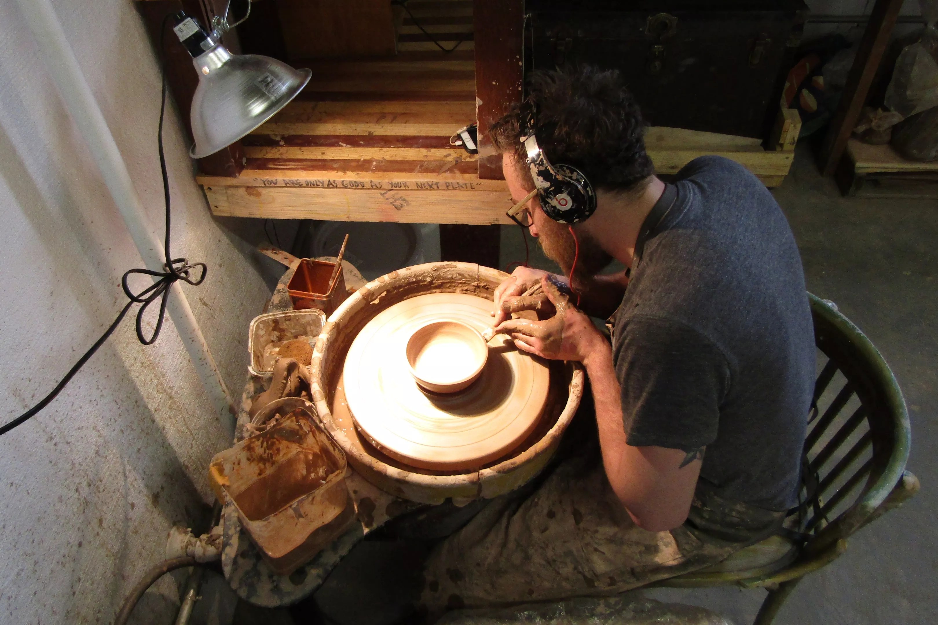 Mencini dons his headphones and takes a seat at the wheel to demonstrate the process of throwing a simple bowl. He leans in close; the clay covers his hands, gets in his beard. Soon a reddish-brown lump spinning at the center of the wheel becomes a column, a squat cylinder, and then, suddenly – it blossoms in Mencini’s hands into a gracefully curved vessel. The bowl is perfectly symmetrical and smooth, the work of a craftsman, not a hobbyist.