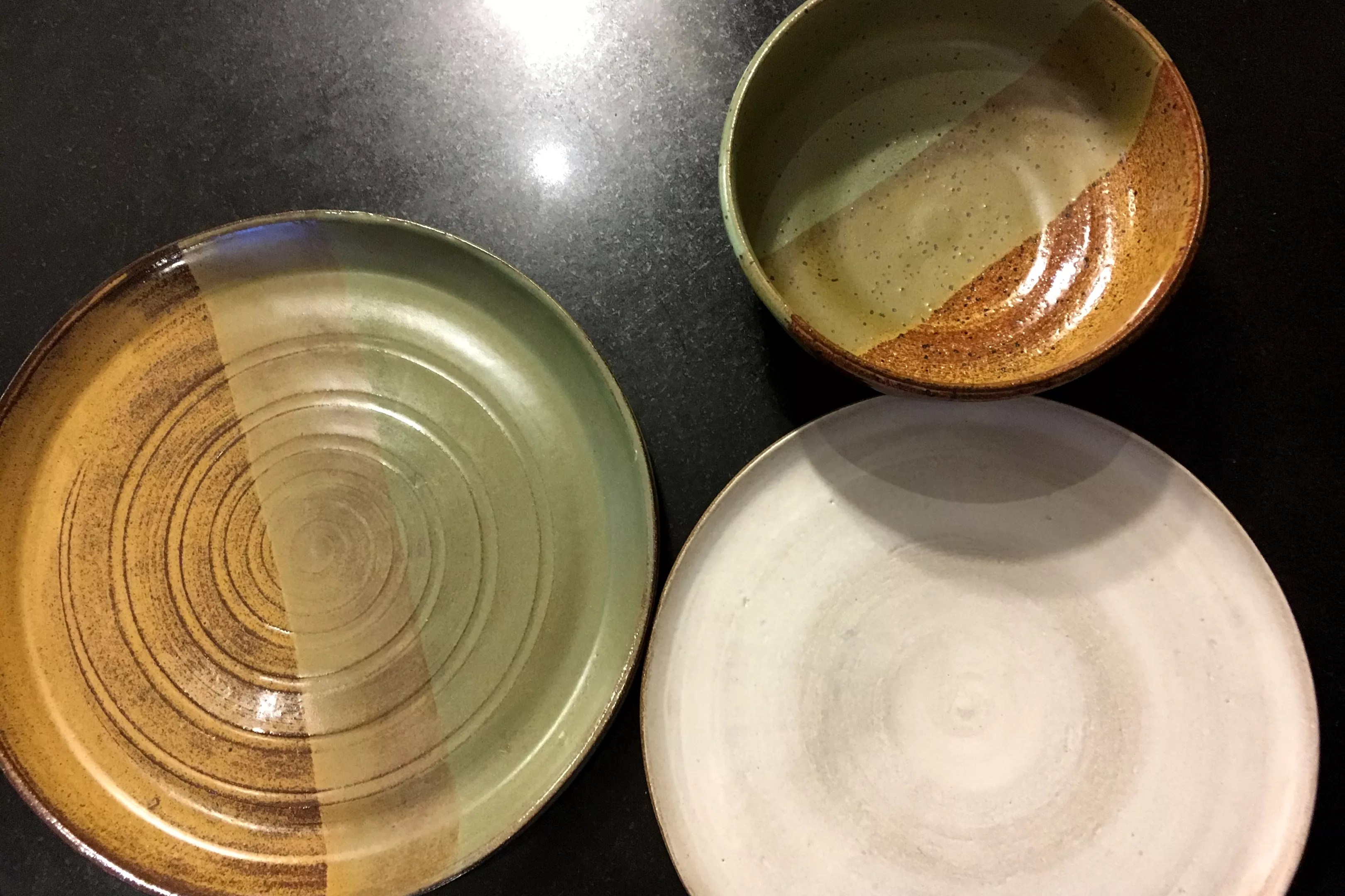 Mencini holds up a small, slightly asymmetrical cup. It’s a little thick and clunky, something you might drink coffee out of at home. “This is my first piece,” he says. Alongside a collection of other platters, bowls and cups in mostly earth-toned finishes that he uses as a kind of sales kit when visiting restaurants, that little cup stands as a reminder of how far he’s come in such a short period of time. His pieces can best be described as earthenware; some bear the grainy texture of the clay, and nearly all come in shades of green, gray, tan and rust (with a few bolder mineral blues and blacks) that enhance their origins in the earth.