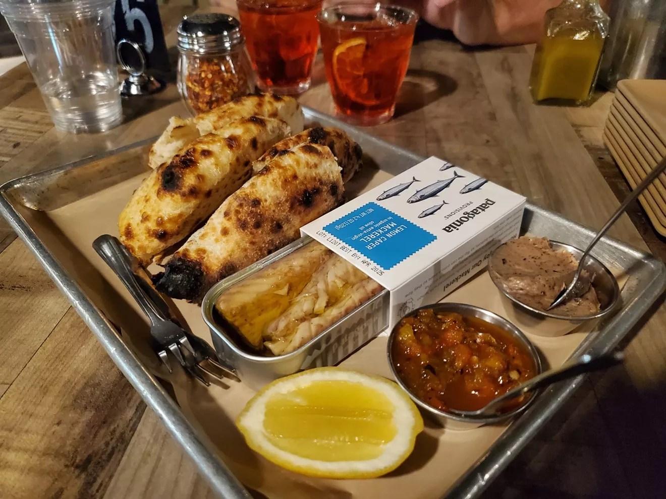Out before it is in…$27 tins of smoked fish with six crackers served on a cutting board.
