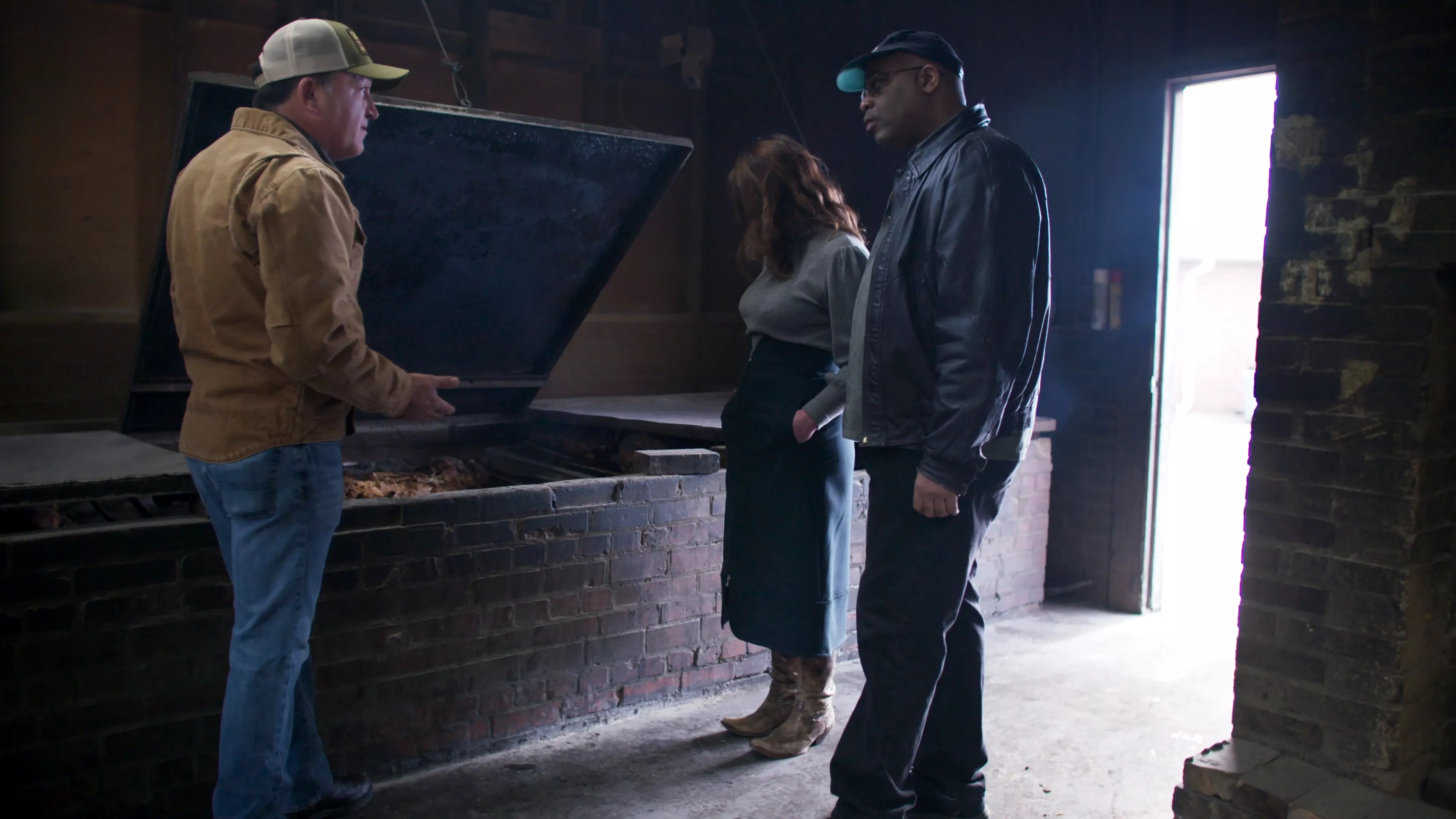 Sam Jones (left) shows off the barbecue pits at the Skylight Inn to Adrian Miller and Vivian Howard.