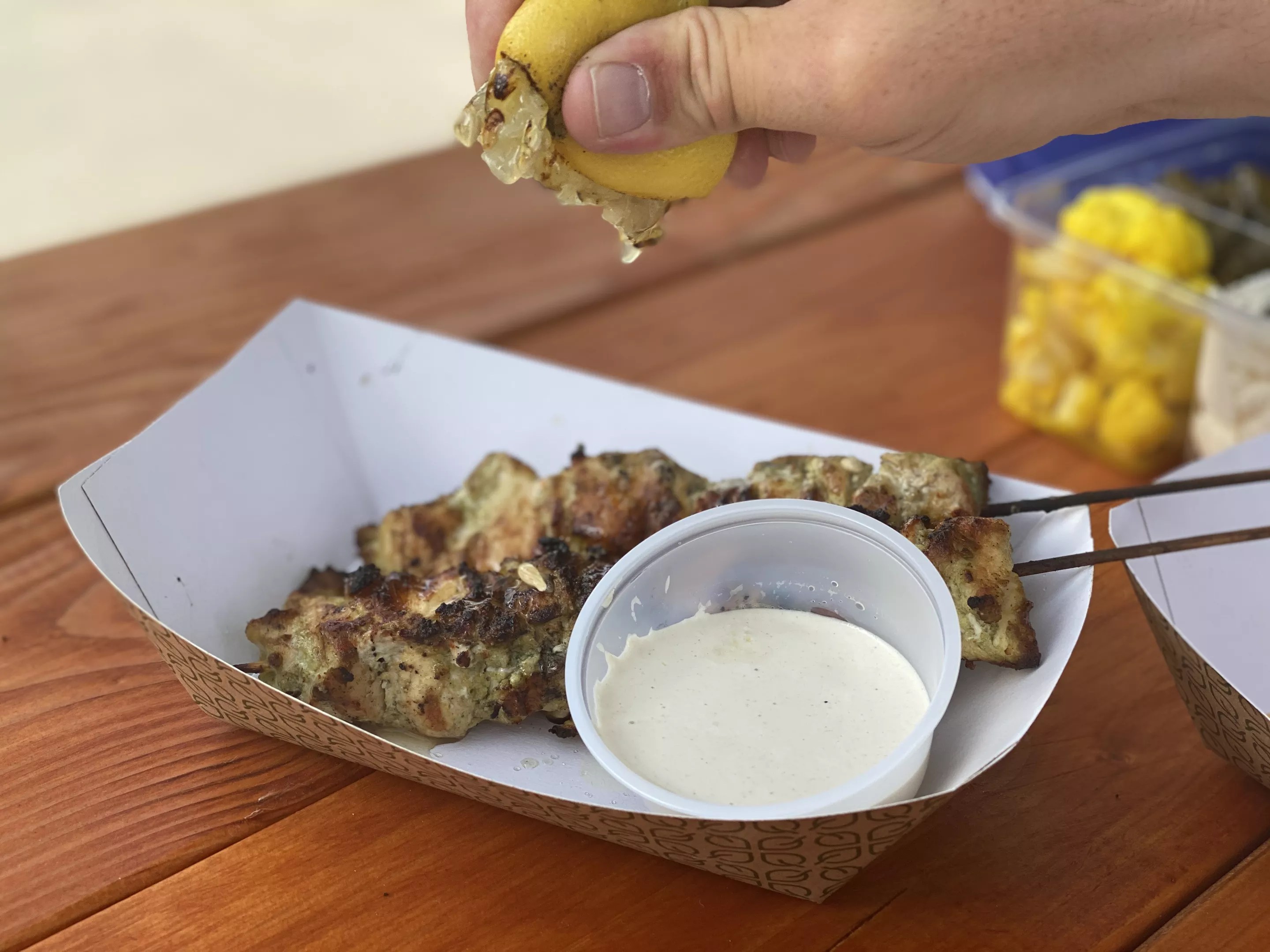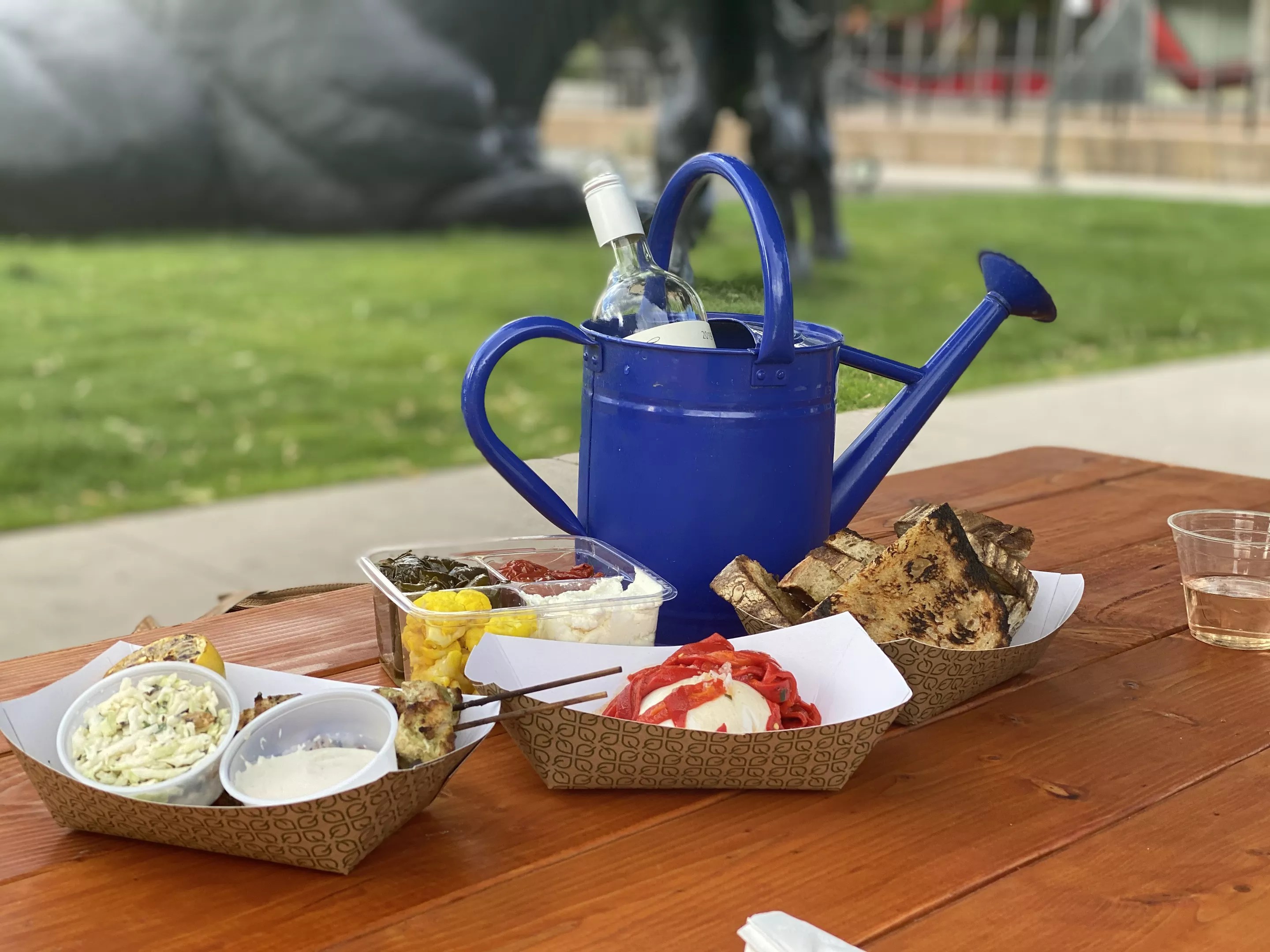 The wine arrived in a quaint watering can filled with ice water, along with three plastic cups. Next came the tasty chicken kebabs, neither too dry nor particularly moist, accompanied by a grilled lemon and tahini dipping sauce. We shouldn’t have been surprised to see everything arrive in paper boats and plastic containers; we realized that we were trading style for safety – and it also makes it more feasible to grab everything to go should you want your picnic at home.