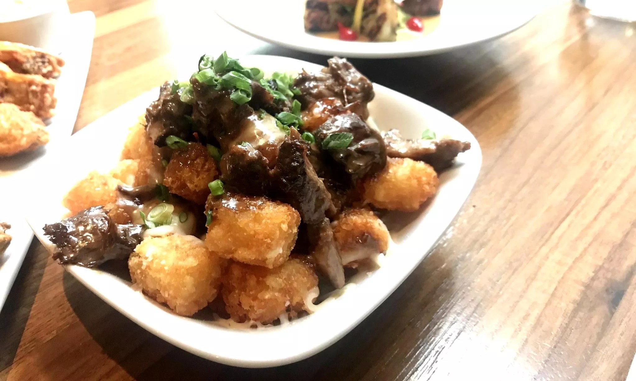 The food arrived at once, which didn’t feel as daunting as last week’s endeavor at Humboldt, since the five daintily placed grilled shrimp were served cold, allowing us to focus on the wings and poutine. And thank the powers that be for that, because Courier took every complaint we had about last week’s poutine and knocked it out of the park with its version of this hefty, mouthwatering, Canadian drunk food. Atop the perfectly crisped pile of tater tots (which I’ve recently been warming up to as a fried potato alternative), a dark gravy with succulent pillows of short rib flowed. It was everything I could do to stop myself to sample a chicken wing before promptly returning to, and polishing off, the divine offering.