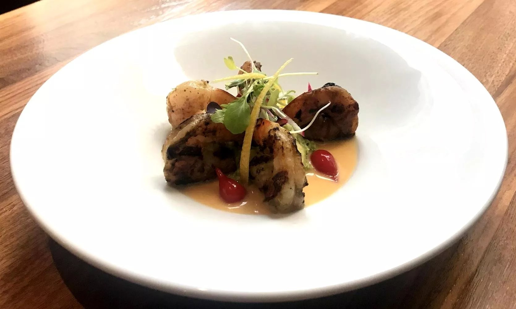 Once I switched to the wings, I found them aromatic, truly crispy and nicely sized, but the accompanying avocado crema felt a little too sturdy for its purpose. Meanwhile the grilled shrimp were something to behold, carefully held in place by avocado, whose sole purpose may have been as a kickstand, and attended by piquillo peppers that exploded delightfully in the mouth, and a dainty topping of microgreens and radish matchsticks. While it took a moment to adjust to the mental disconnect I felt seeing the grill marks and tasting an entirely cold dish, the composition was fresh, summery and, as Kettler might say, dignified.