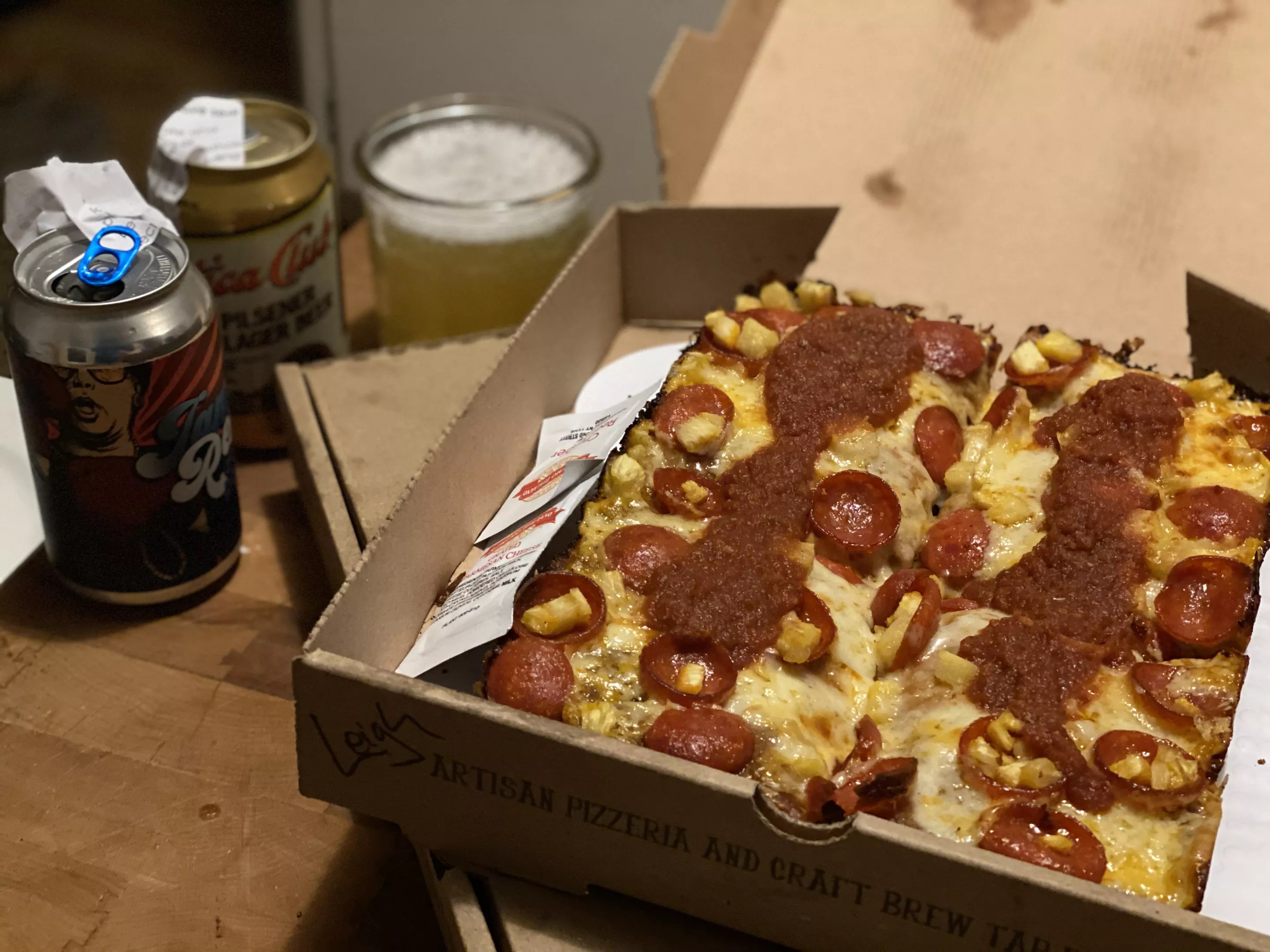 My frequent process is to get one of each pizza styles: the traditional crust (here made with IPA in the dough) and the Detroit, because leftover pizza never goes uneaten. This round my friends and I opted to put my favorite topping combo – sweet pineapple and spicy pepperoni (which I will argue to the death is superior to the standard Hawaiian) – on the Detroit-style, and stuck with the kitchen’s conception of a Margherita on the traditional crust. For beers, be careful when perusing the $2 specials: You might also find your eye resting on a can that could ring in at $8. No matter which beer you select, though, most of the specials are about half off the normal price.