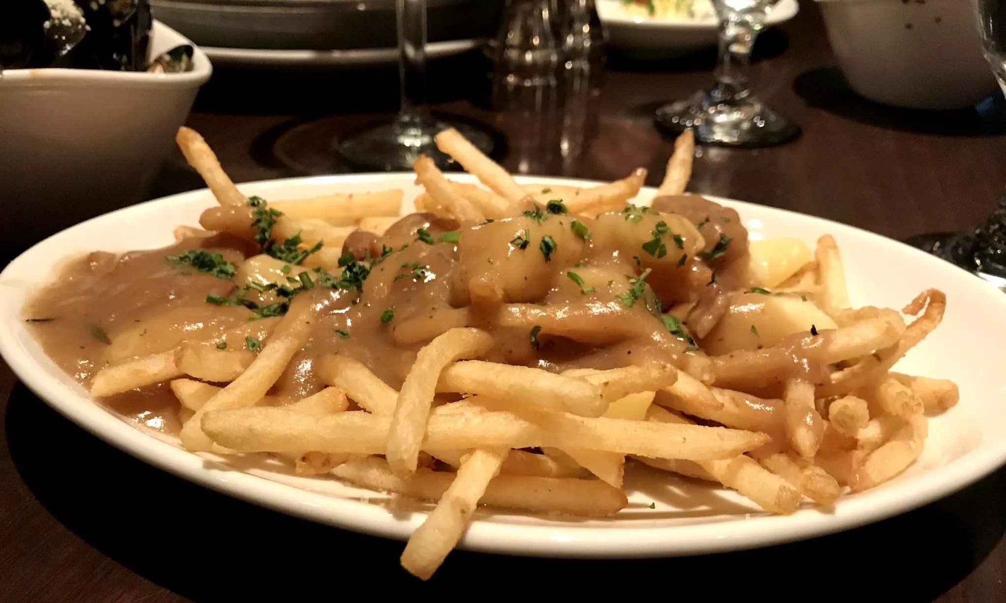 A glance at the menu revealed similar attention to discerning happy-hour deal seekers: Both food and beverage menus clearly delineate between $5 or $7 options, with two Boulder beers on special for $4. Perhaps it was the phantoms of Strings that compelled us to start off with two martinis ($7), one classic and one dry, and a prosecco ($5) to pair with the $1.50 oysters. We couldn’t help but select most of the $7 dishes: poutine, crispy wings and steamed mussels, as well as the deviled eggs and fried green tomatoes from the $5 section. The food arrived in one fell swoop – not ideal, but to be expected when happy hour is ending and dinner service is about to enter full swing. This did, however, make it a challenge to decide which time-sensitive food to dig into first.