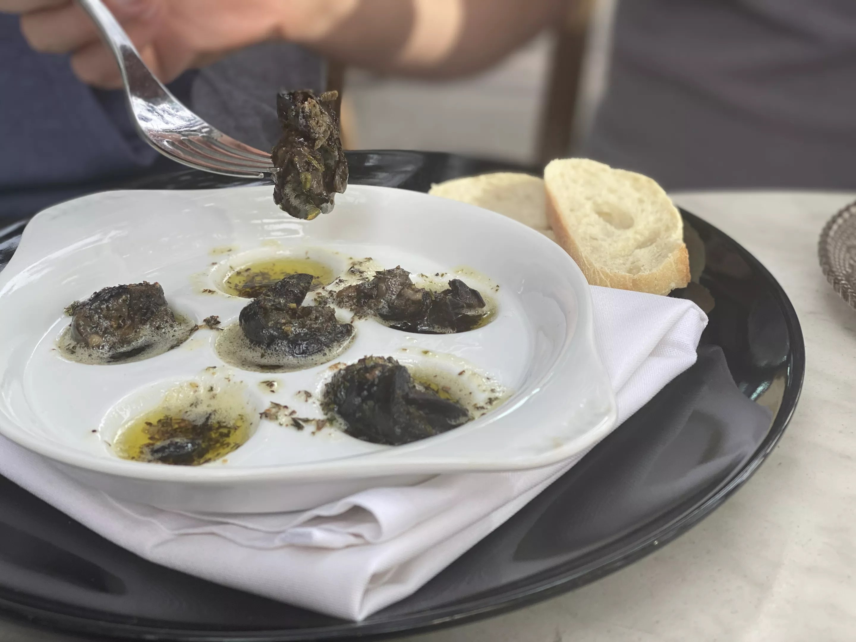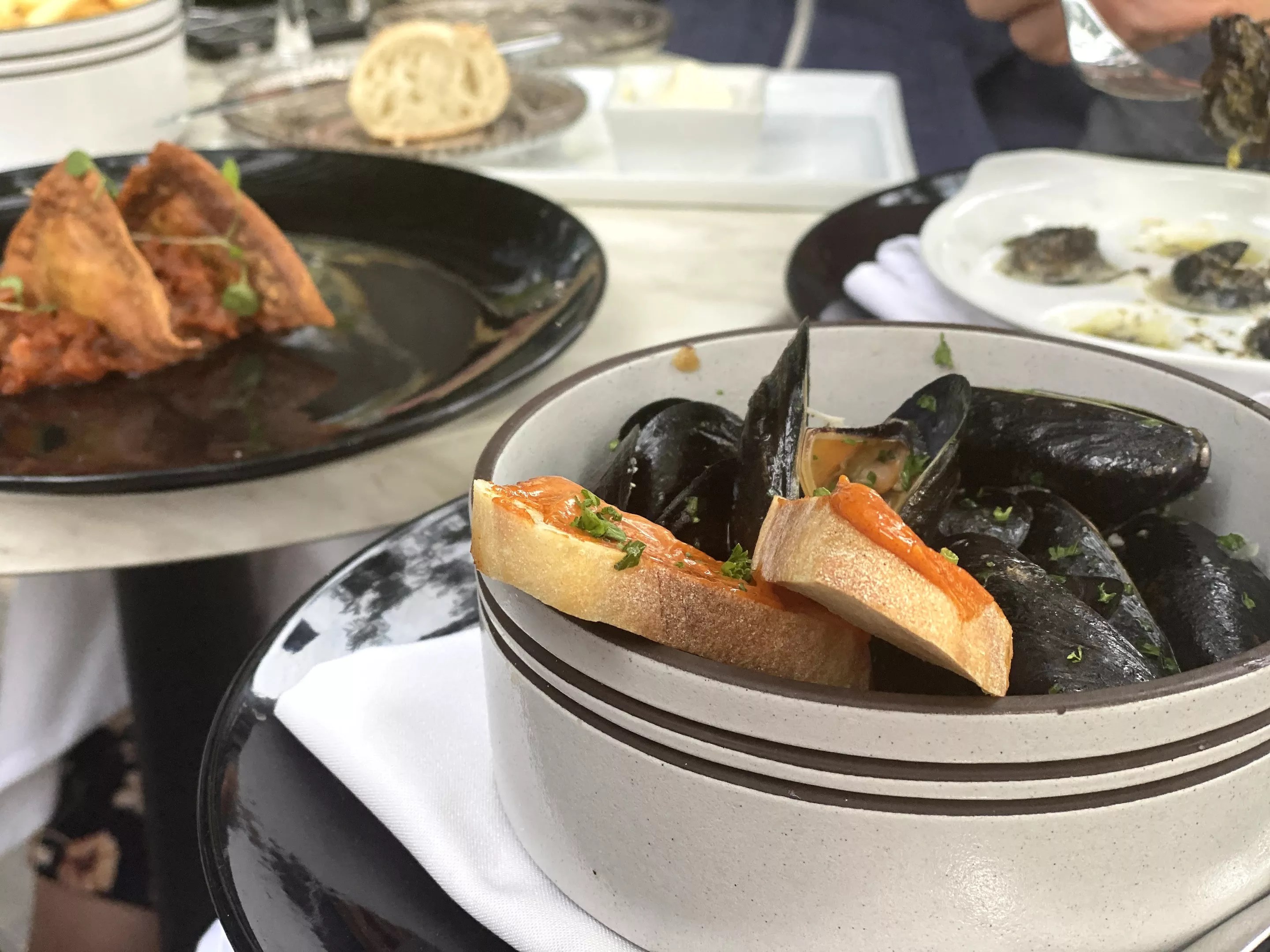 Soon enough, our dimpled plate of snails arrived, each de-shelled escargot swimming in its personal pool of butter. It had been a while since I’d eaten escargot, but I’m almost certain these were the best I’ve ever had – though that could have been the butter talking. The mussels were classic – not stunning, but worth ordering just for the frites: perfect crunchy potato sheaths surrounding soft insides. The intriguing tuna-filled “pastels” were fried darker than expected and served with a simple Senegalese-style tomato and onion sauce. And if you’re looking for a few extra carbs, I’d recommend paying a little extra for the housemade croissant over the baguette.