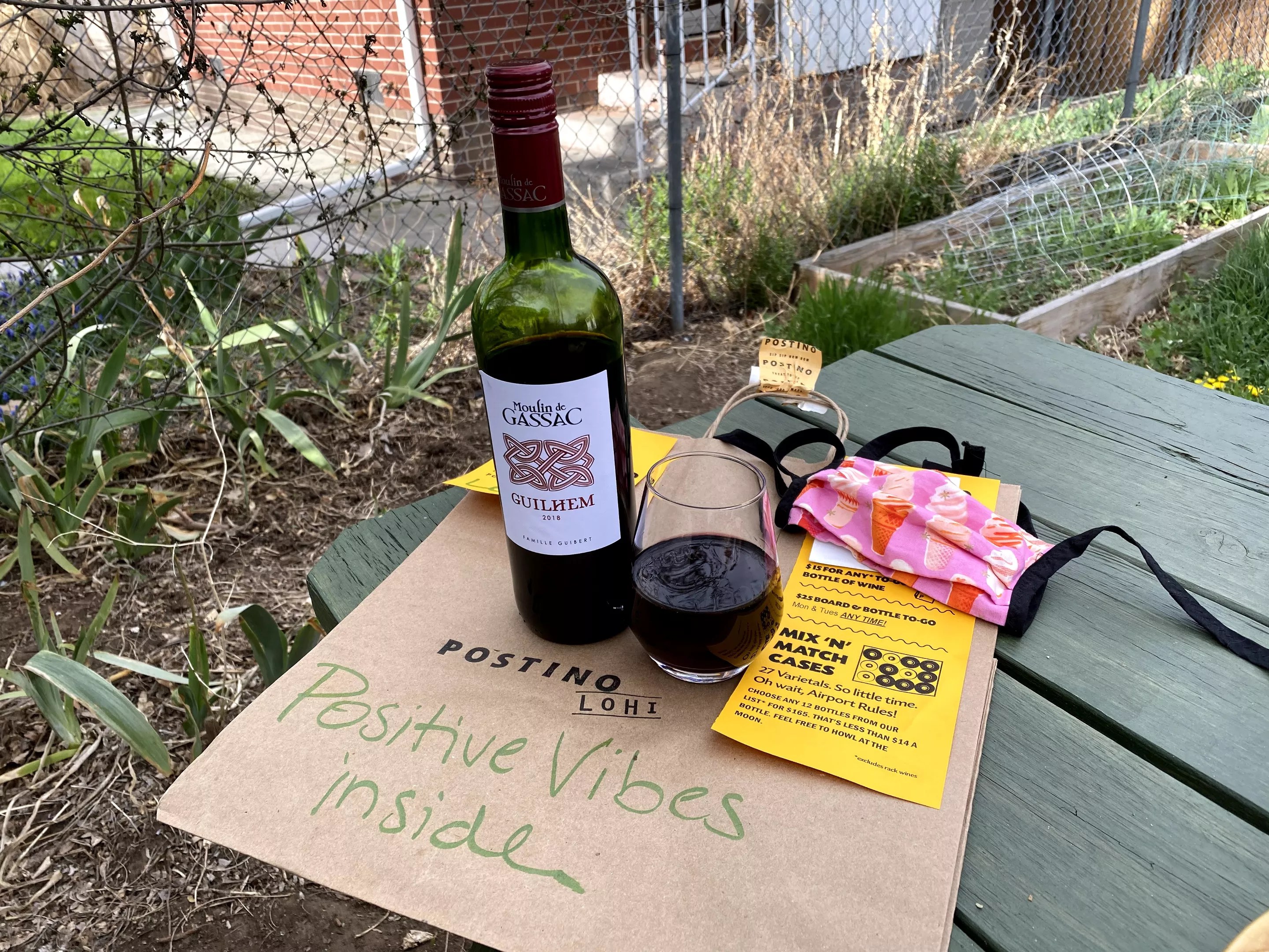 Apart from coming to a full stop on 17th Street’s hella steep hillside, picking up curbside at Postino’s LoHi location was a breeze. Just inside the door, happy packages including your name, receipt and handwritten notes with friendly messages like “Good vibes inside” sat at the ready along a table. I slipped in, grabbed mine, Tetris’d the many to-go containers into my bag, and skated up the hill toward home, where I realized that there was far more of a feast than I’d imagined as we pulled out box after box and uncapped one of the wine bar’s recommended $15 red blends to go with our feast.