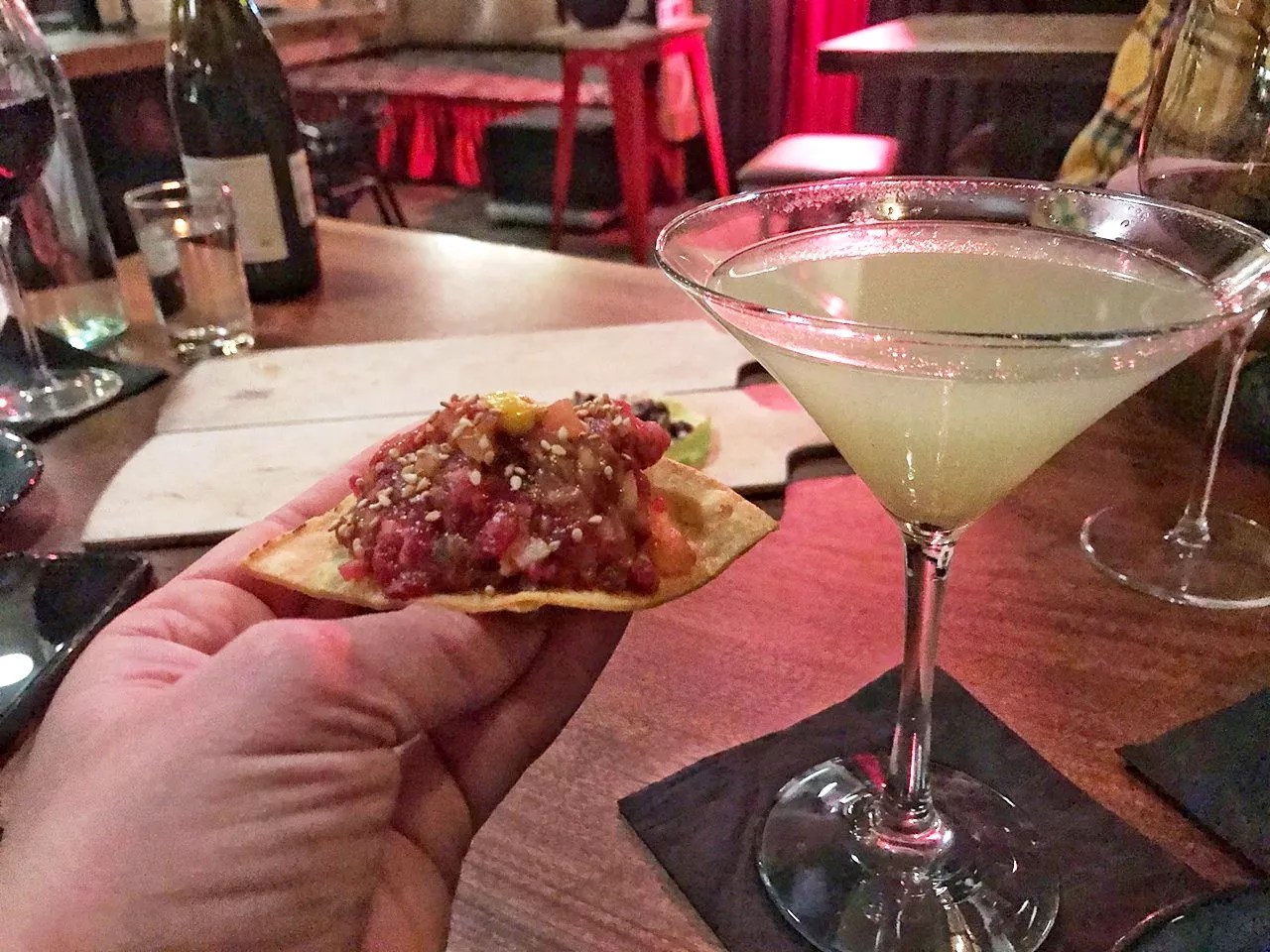 A cocktail and a wagyu tostada.